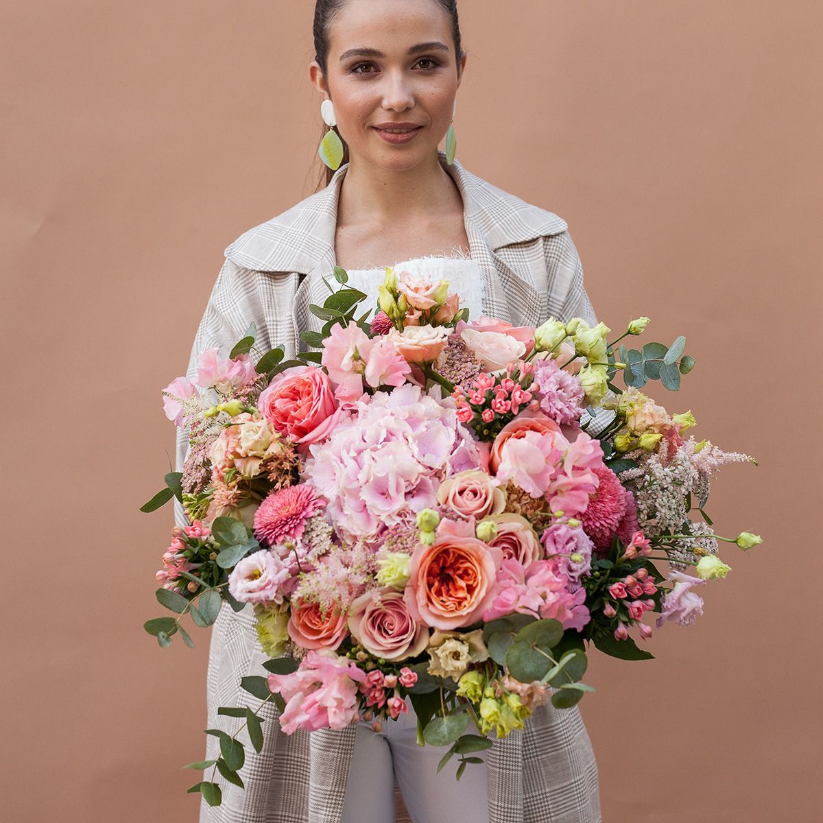 Если надоели стандартные сочетания цветов, присмотритесь к этой композиции. Привычные гортензии, розы и эустомы розовых оттенков разбавляются нежной бувардией, розетками ахиллеи, свежими листочками эвкалипта. Создается ощущение, что весь луг во всем его многообразии уместился в один букет. Такое решение будет актуально на дне рождении и любом другом празднике.