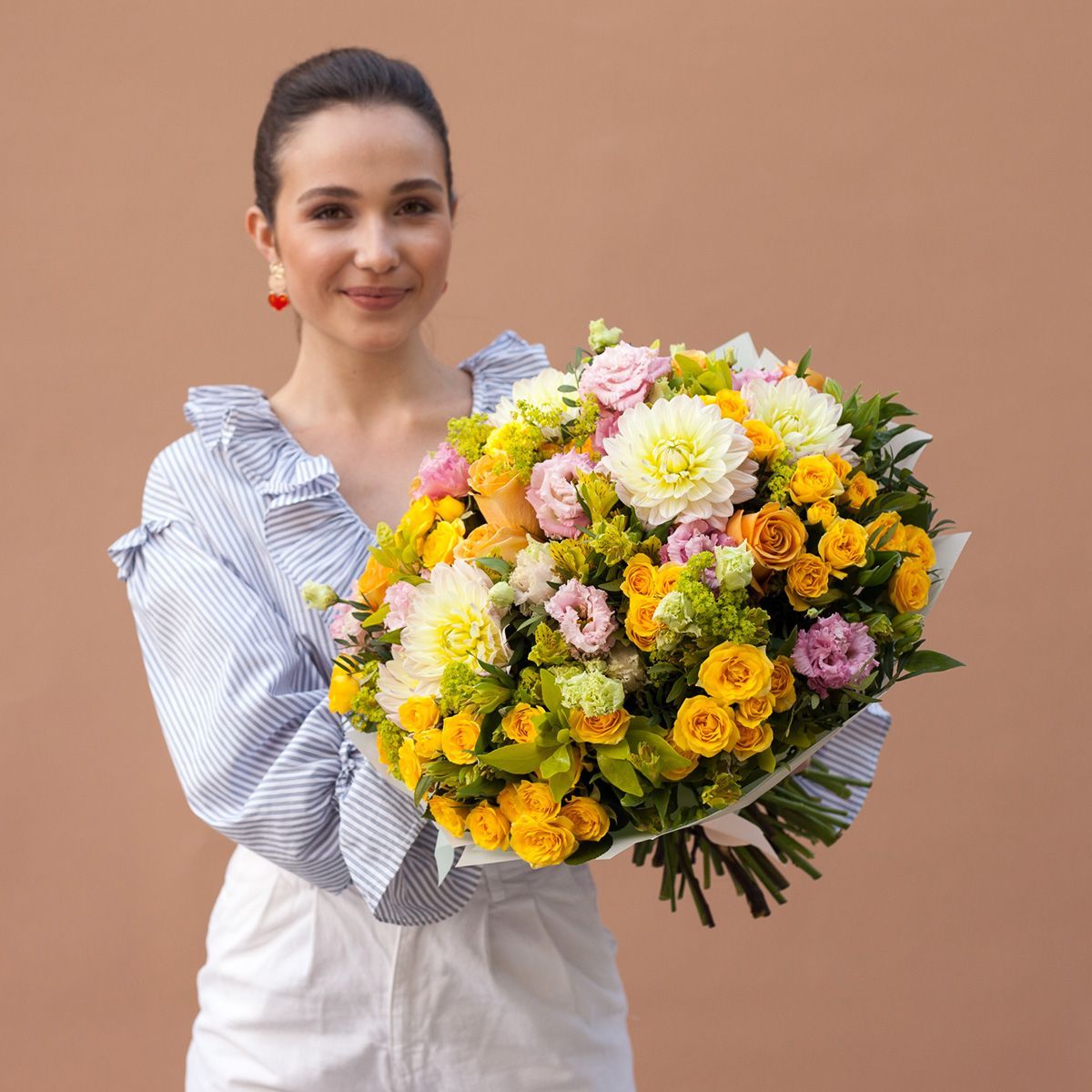 С летними днями и теплом ассоциируется свежий букет из георгин, алхемилл, кустовых и эквадорских роз, альстромерий с добавлением эустом, шуазий и листьев фисташки. Яркие цвета композиции оттеняет упаковка нейтрального оттенка с лентой. Поздравить ей с важным событием можно жену, сестру и маму. Красивый подарок поможет без слов выразить чувства, а открытка дополнит эффект поздравления. Купить цветки в каталоге интернет-магазина возможно в любом размере. Цены и фото указаны рядом с доступными к заказу позициями. При оформлении сборки цветов к празднику в любом количестве действует доставка.