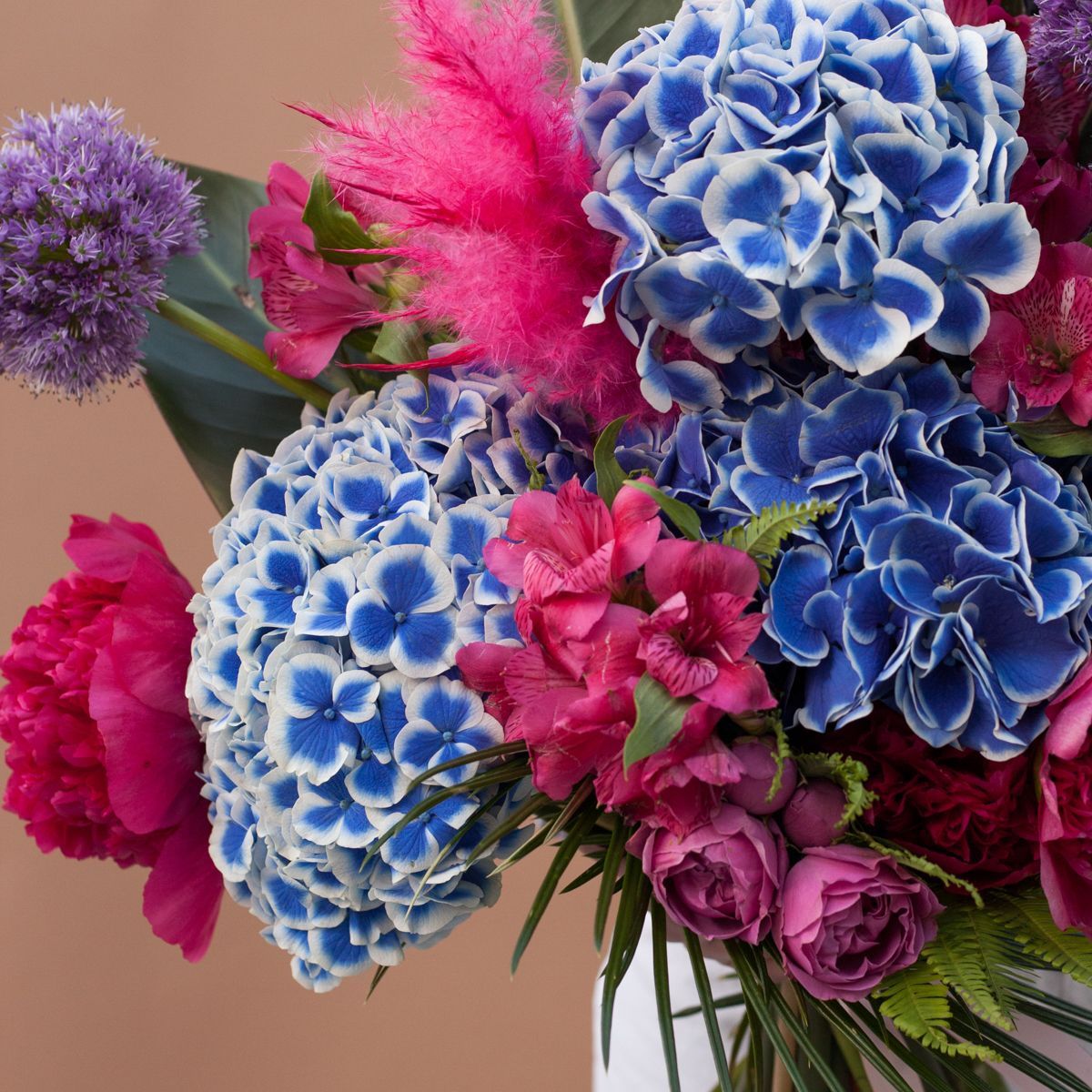 Яркий букет в розово-синем цвете без упаковки — идеальное поздравление для активной и артистичной девушки на день рождения. Авторская композиция к празднику включает гортензии и аллиумы, кортадерии и геликонии, альстромерии и кустовые пионовидные розы. Эти цветы в сборке с не менее красивыми пионами, робилини и амбреллами в большом количестве создают притягивающую взгляд картину. Перевязанные лентой розового оттенка свежие бутоны отлично выглядят на фото, а вместе с открыткой в подарок к заказу выразят искренние чувства и пожелания дарителя. Каталог интернет-магазина с ценами позволяет поздравить сочетанием любого размера, а купить его можно с бесплатной доставкой к событию.