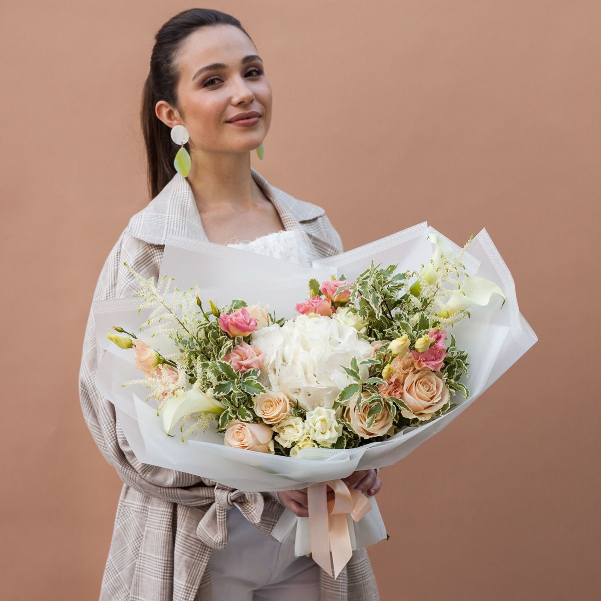 Нежные, будто бы летящие композиции — отличный выбор подарка на День матери. Букет, в центре которого размещена пышная белая гортензия, не останется незамеченным на празднике. Вокруг бутона расположились цветы кустовой розы и сорта из России персикового оттенка, белоснежные каллы и небольшие светлые эустомы. Их гармонично разбавили астильбы, пионы и веточки питтоспорума, которые освежают ансамбль и создают по-настоящему весеннюю атмосферу. Матовая упаковка, перевязанная лентой нежно-абрикосового цвета, дополняет цветочную картину и вместе с ней делают сочетание стильным и утонченным. Размер готового презента для мамы можно подобрать перед заказом, заранее посмотрев фото в каталоге.