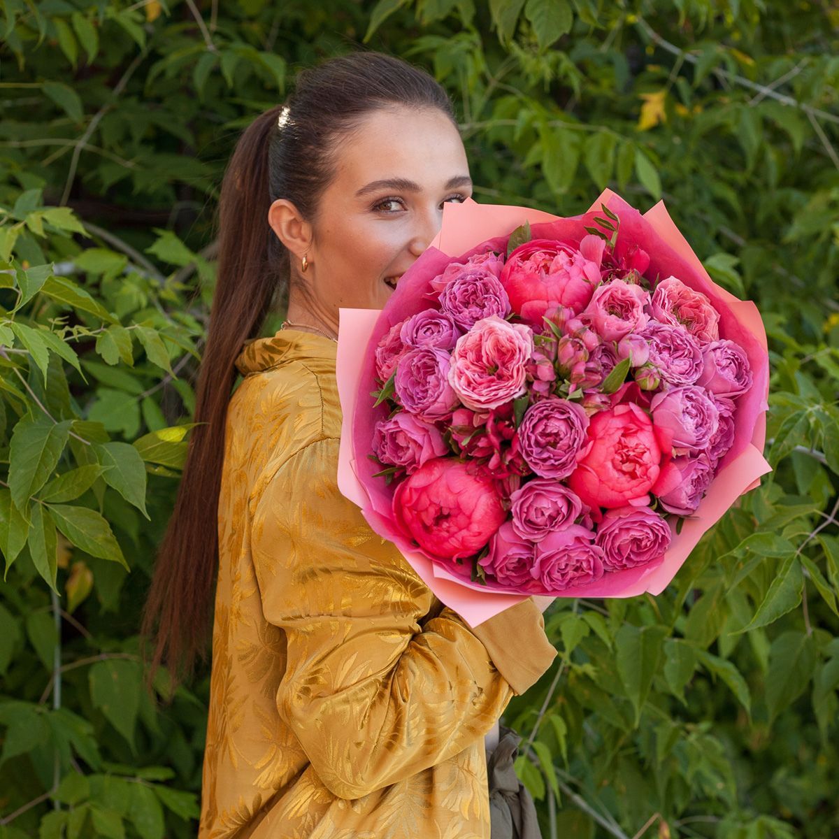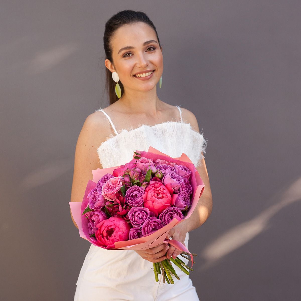 Не знаете, как словами эффектно выразить чувства в день праздника или без повода? Подарите любимой милый и трогательный букет в красивых розовых оттенках. Композиция из пионов и альстромерий с кустовыми пионовидными и садовыми розами в упаковке малинового цвета с лентой — воплощение женственности и искренних чувств. Поздравление такими яркими свежими цветами с днем рождения напомнит о весенних днях и принесет позитивный настрой. При сборке мы положим открытку, куда вы сможете записать теплые пожелания. Купить подарок в каталоге можно в любом размере и с разным количеством цветков. Чтобы сделать заказ и поздравить именинника, посмотрите фото с ценами в интернет-магазине, оформите доставку к событию.