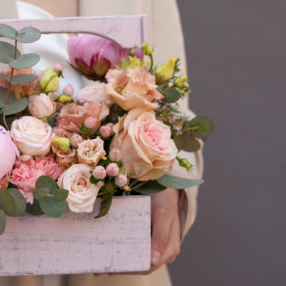 Разбавить хмурый осенний день и добавить ярких красок в жизнь любимой девушки или мамы можно при помощи нежного, собранного в розовый деревянный ящик букета. Композицию из пионов, гвоздик, эустомы и орхидеи дополняют два сорта королевы цветов: кустовые розы и розы из Эквадора. Многообразие оттенков и форм уравновешивают мелкие бутоны хамелациума и гиперикума, а эвкалипт освежает пышную цветочную картину. Размер подбирается с учетом ваших пожеланий при заказе, а я при необходимости отправлю фото готового презента.