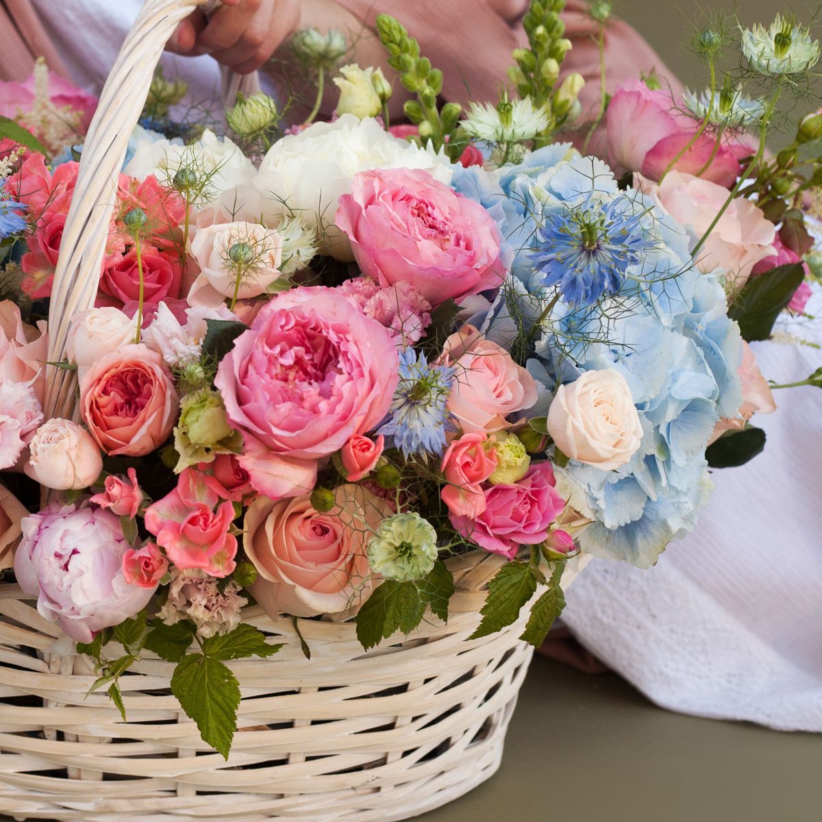 Корзина из роз, пионов и эустомы розового цвета — отличный способ поздравить женщину или мужчину в день рождения или в честь любого другого праздника. Нежная пастельная палитра выгодно дополняется голубыми гортензиями, свежими нигеллами и зелеными листочками. В итоге корзина, в которую помещается более 70 штук цветов разных оттенков, выглядит, словно красивая клумба. Такой подарок придется по вкусу любому получателю, а упаковка упростит поздравление.