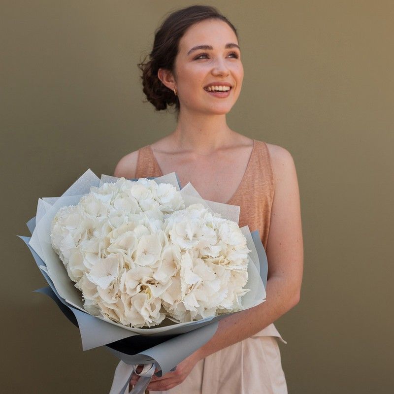 Нежные пушистые гортензии в матовой упаковке светло-серого оттенка с лентой голубого цвета — идеальный подарок девушке на праздник или любимой жене на выписку из роддома. Красивый букет навевает нотки романтики и легкости, напоминая о солнечных весенних днях. Свежие цветки, как легкие бабочки, создают незабываемое поздравление, которое выигрышно смотрится на фото. При сборке мы положим внутрь открытку, чтобы вы смогли поздравить любимого человека еще и теплыми словами. В каталоге интернет-магазина представлен размер композиции из 5 штук, но вы можете купить цветы в любом количестве по доступной цене. Оформить доставку заказа можно к событию.