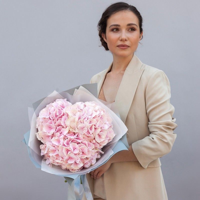 Лаконичный однотонный букет — универсальный подарок на любой праздник как для молодой, так и для взрослой женщины. Композиция из трех гортензий кремово-розового оттенка с пышными краями лепестков разбавит осеннюю грусть и растопит сердце даже самой неприступной дамы. Цветы скажут об искренности и чистоте намерений дарящего, а общий вид ансамбля скажет получательнице о его хорошем вкусе. Матовая упаковка в нейтральных тонах, перевязанная лентой, добавляет изящества и гармонии. Вы можете выбрать подходящий размер при заказе, а я при необходимости отправлю фото готового презента.