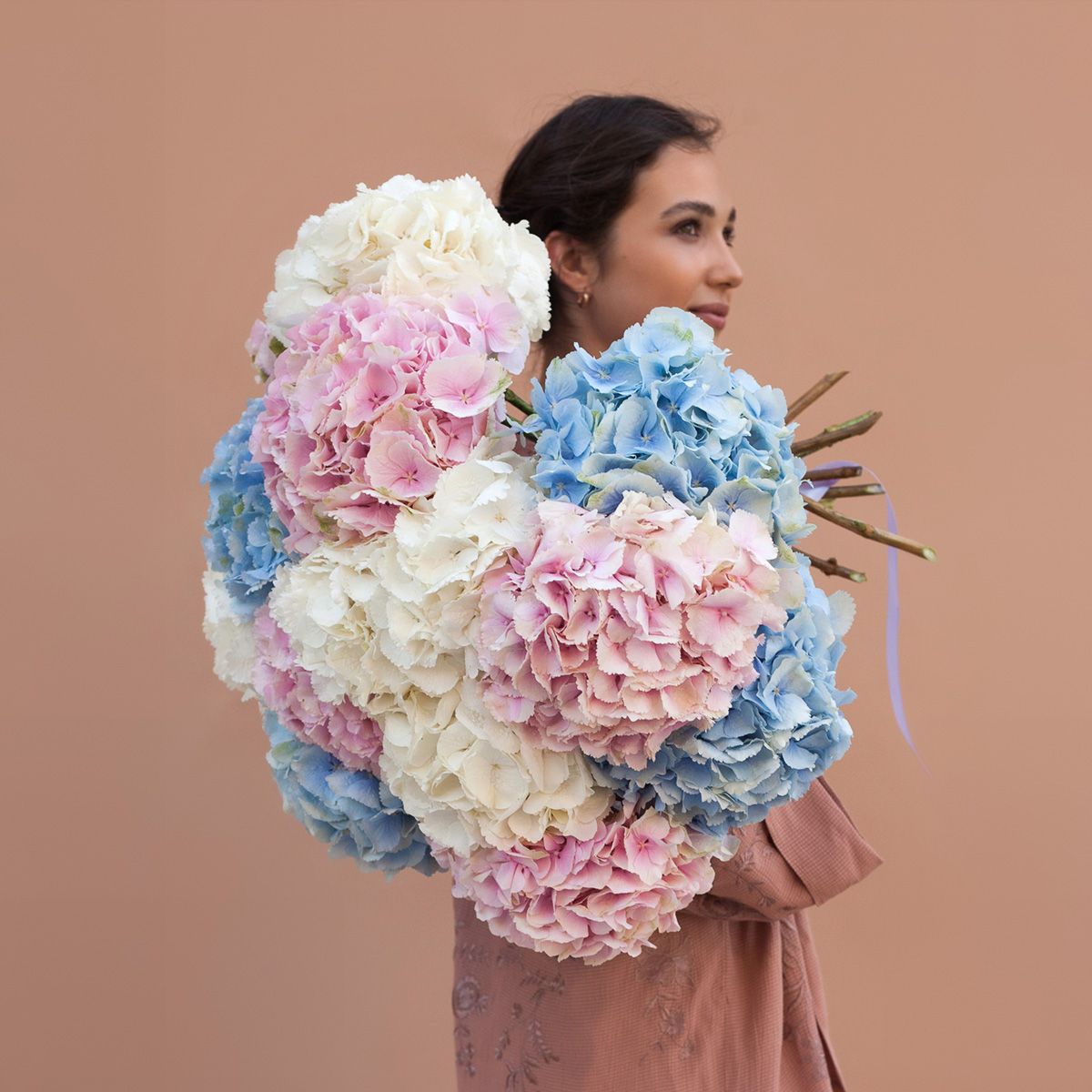 День рождения, юбилей или другое важное торжество - лучший повод поздравить получателя красивым букетом, напоминающим о летних днях. Голубые, розовые и белые цветки свежей гортензии будут отличным подарком для женщины любого возраста и статуса. Похожее на разноцветное облако поздравление в виде 15 цветов нежных оттенков запомнится надолго, а быстрая доставка позволит получить заказ перед праздником. Композицию без упаковки, перевязанную лентой сиреневого цвета, флористы собирают с любым количеством растений. В каталоге интернет-магазина можно купить варианты разных размеров, посмотрев фото с ценами.