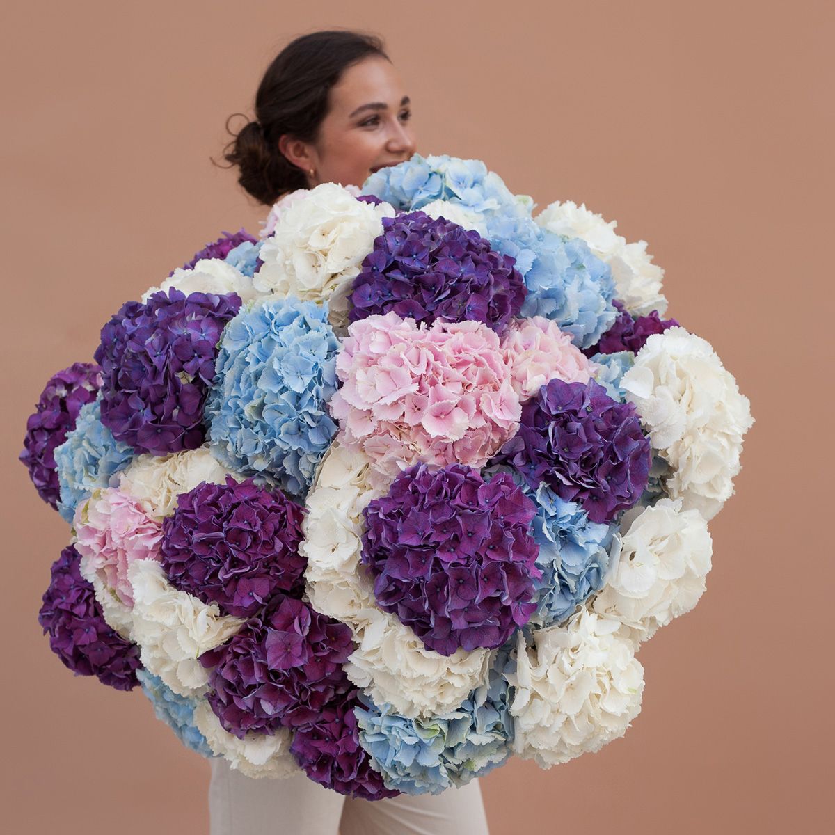 Невероятный букет, к которому сложно подобрать эпитеты. Он создан покорять, восхищать и навсегда оставаться в памяти. Это изумительное решение для самых строгих и требовательных клиентов, которые ценят креативные флористические решения и небанальные цветочные композиции. Потрясающая цветовая гамма, в которой гармонично сочетаются между собой объемные шапки гортензий небесно-голубого, пудрово-розового, насыщенного фиолетового и торжественного белого тона. Букет имеет внушительные размеры, гарантированно произведет самое приятное впечатление на всех гостей праздника.