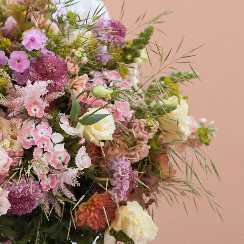 Бохо-стилистика при сборке композиций актуальна вне времени: она выглядит естественно, будто красивые цветки в огромном количестве только что сорвали. Поздравить букетом можно с днем рождения и другими праздниками или подарить цветочное поздравление без повода. Для подарка мы перевязали лентой розового оттенка антирринум, астильбы, маттиолы, эустомы и скабиозы без упаковки. Яркости цвета добавили при помощи флоксов, георгин, авен и физокарпуса. Купить свежие цветы с открыткой к событию в каталоге интернет-магазина просто: выберите сочетание по фото, размеру и цене заказа, оформите доставку.
