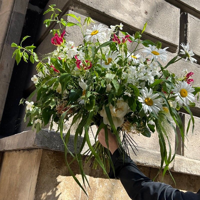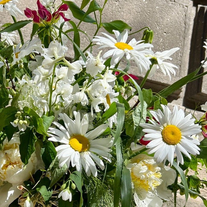 Оригинальный букет, подкупающий натуральной красотой и природным совершенством простых, но любимых многими, классических ромашек. Помимо них в композиции органично смотрятся белоснежные крупные пионы, редкая и эффектная глориоза, нежный дельфиниум. В качестве декоративных элементов в букете использованы пышные соцветия паникума, которые делают композицию объемной и оригинальной. Великолепный выбор для тех, кто ценит лаконичный современный дизайн во флористике, его аристократизм и совершенство в простых формах.