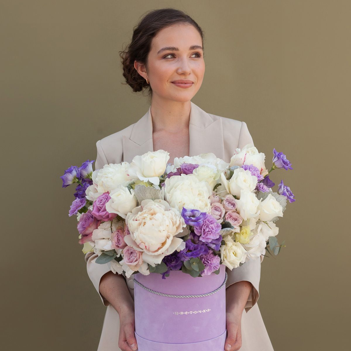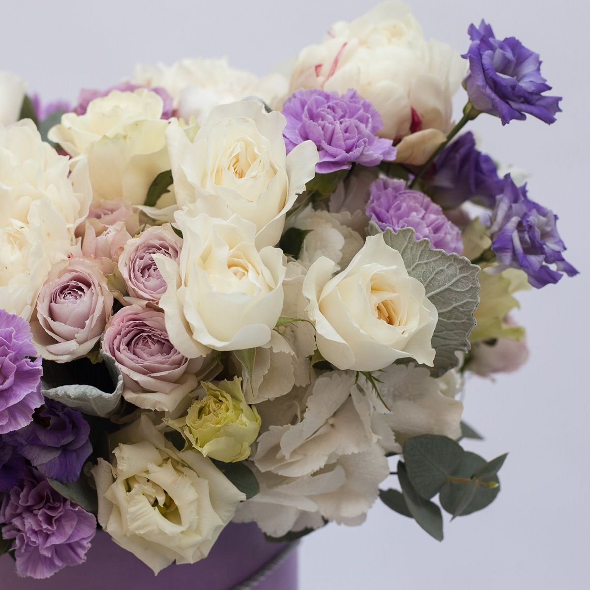 Микс из свежих гортензий, пионов, эустом, гвоздик и трех видов роз (садовой, российской и кустовой) нежных оттенков создан покорять сердца. Характера в композицию добавляют красивый сенецио серебристый и эвкалипт. Поздравление с цветами в шляпной коробке подойдет для дня рождения, выписки из роддома и других праздников – стильная упаковка и сочные цвета уместны на любом событии. Мы предлагаем поздравить любимую заказом с доставкой и открыткой внутри. Флористы соберут букет с цветками в любом количестве: до того, как купить подарок, размеры, цены и фото можно посмотреть в каталоге интернет-магазина.