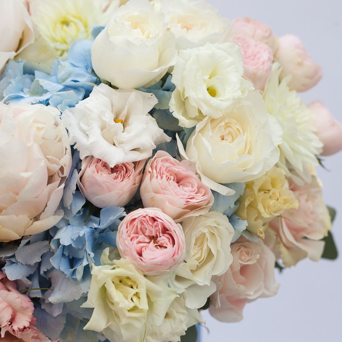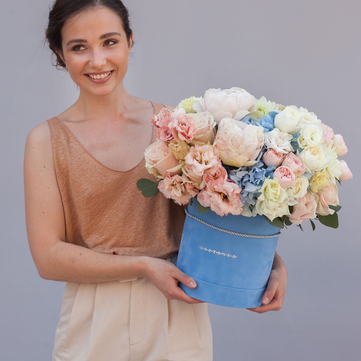 Композиция в шляпной коробке идеально подойдет для дня рождения и для любого другого важного события. Нежное сочетание пионов, кустовых роз, георгин пастельно-розовых оттенков напоминает весенний сад, который робко расцветает после затяжной зимы. Из-за бутонов весело выглядывают георгины голубого цвета и свежие листочки эвкалипта. Красивый букет можно смело дарить как девушкам, так и женщинам. В упаковке легко размещается более 30 растений.