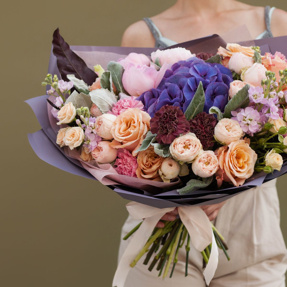 Желание удивить и эффектно поздравить с днем рождения любимого человека вполне понятно. Сделать это поможет яркий букет в сочных оттенках. В композиции собраны свежие пионы и гвоздики, маттиолы и стахисы, которые оттеняют красивые кустовые пионовидные и кустовые розы, гортензия. Удивительный фиолетовый цвет упаковки и ленты подчеркивает и выделяет нежные цветки. На фото в каталоге интернет-магазина представлен большой размер поздравления, но вы можете купить цветы к празднику в любом количестве и по доступной цене с открыткой в подарок. Оформите доставку заказа к событию на сайте.