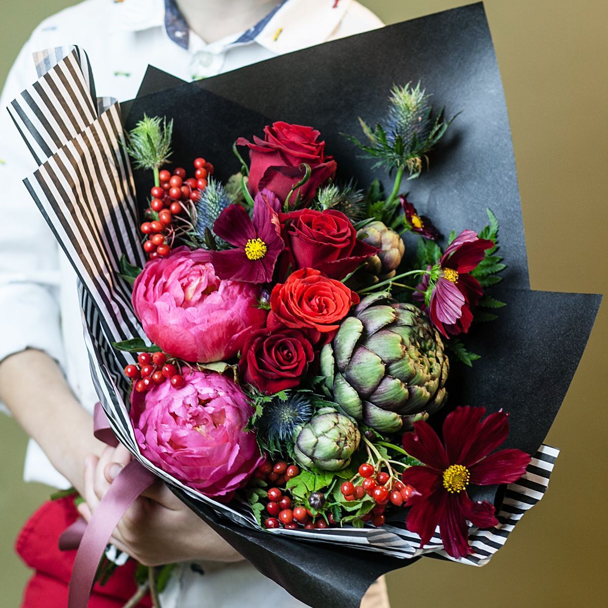 Композиция из космеи, пионов и российских роз с веточками вибурнума и эрингиума — воплощение красок уходящего лета. В центре букета — артишок, который вносит сдержанность и элегантность в яркую палитру цветов. Бутоны розовых, красных и бордовых оттенков дополняет черно-белая бумажная упаковка. Я с удовольствием соберу похожий цветочный ансамбль на 1 сентября и при желании пришлю фото перед отправкой. Перед оформлением заказа на нашем сайте можно выбрать подходящий размер.