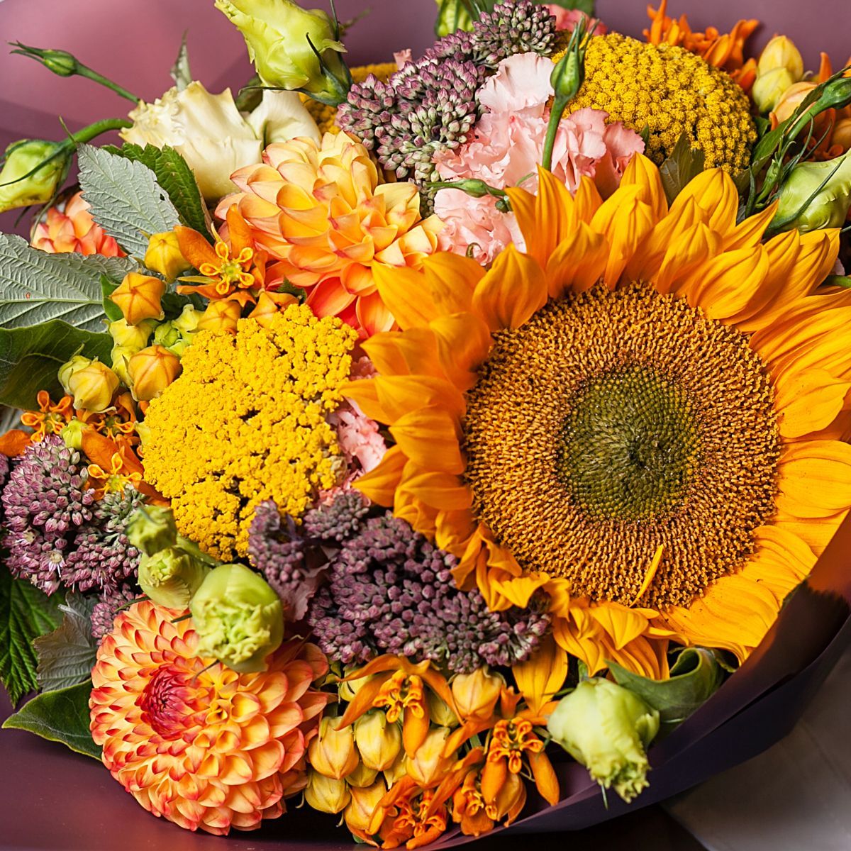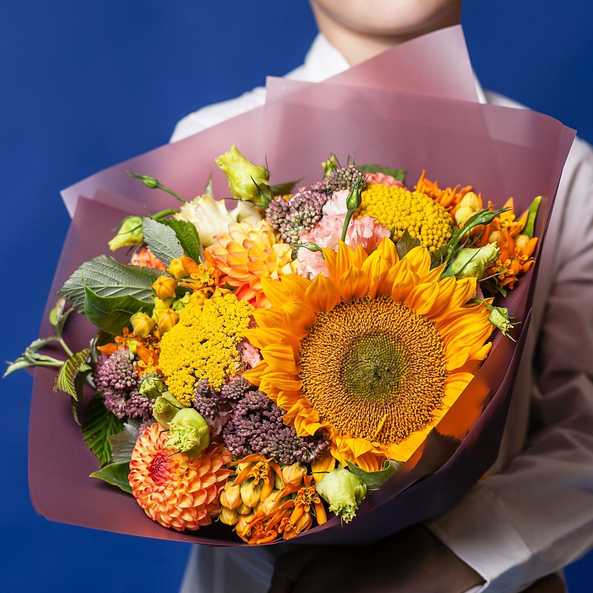 1 сентября — отличный повод вспомнить о ярких красках лета и подарить учителю букет в оранжево-желтых оттенках. «Солнце» композиции — гелиантус (декоративный подсолнечник), рядом с которым разместились бутоны эустомы, асклепиаса и георгин. Зелень седума и рубуса разбавляет насыщенную летнюю картину, а аккуратная упаковка не отвлекает внимание. Заказ цветов возможен даже в небольшом размере, чтобы их легко мог нести первоклассник.