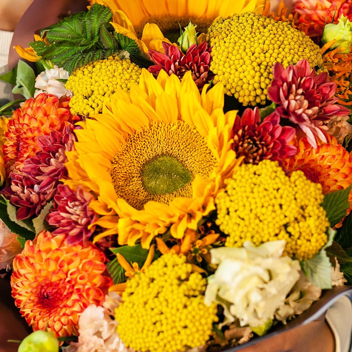 Декоративные подсолнухи (гелиантусы) — цветы, которые никогда не остаются без внимания. В ансамбле с яркими георгинами, хризантемами, асклепиасами и эустомами они создают взрыв красок и позитивного настроения. 1 сентября — отличный повод, чтобы преподнести эти эффектные цветы любимому учителю. Для оформления композиции я подберу упаковку в спокойных оттенках. Фото не передаст всей сочности красок, а чтобы увидеть букет вживую, выбирайте подходящий размер и оформляйте заказ!
