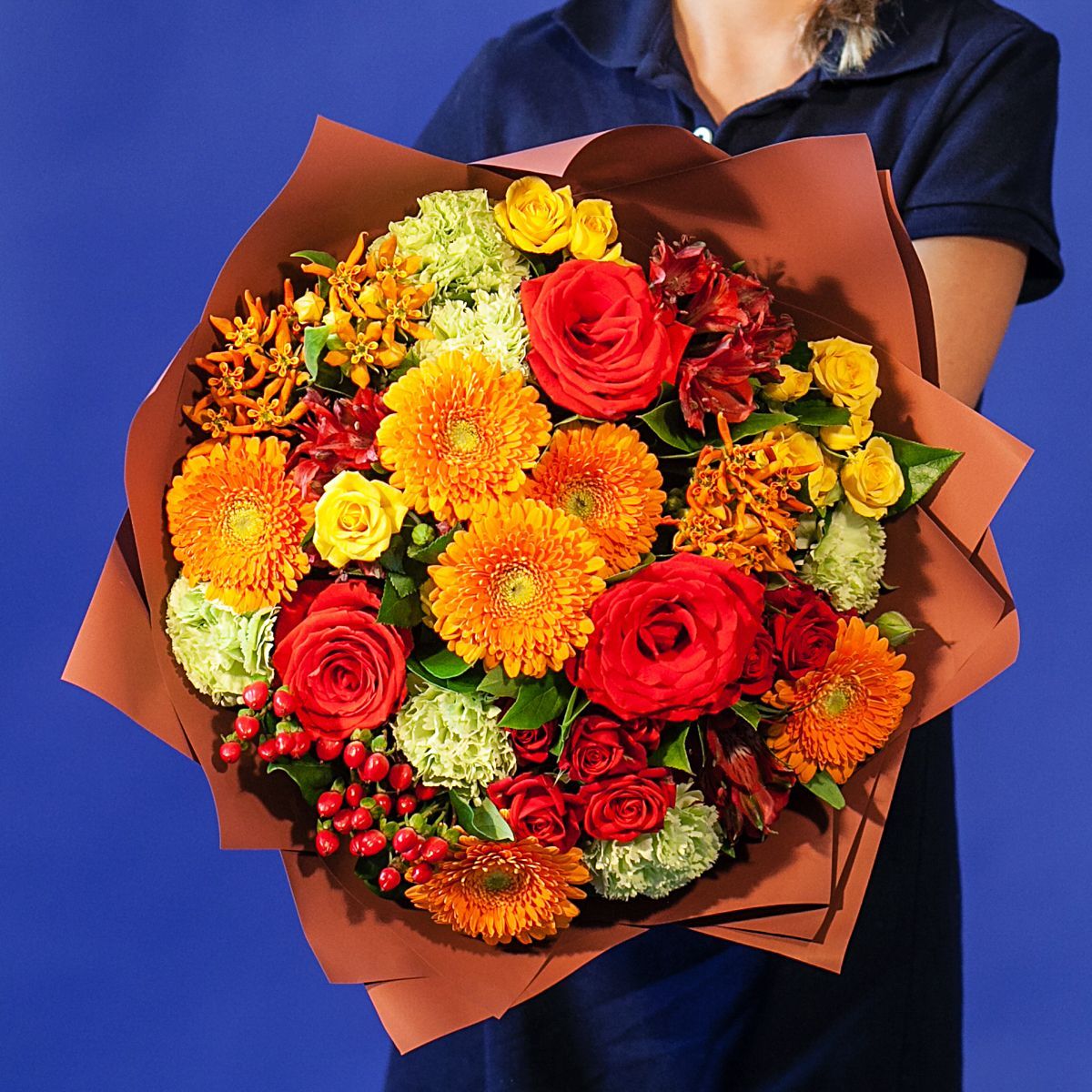 Кустовые розы давно стали классикой подарочного букета на 1 сентября. Их яркие бутоны в сочетании с желтыми и оранжевыми герберами, гвоздиками, асклепиасами и альстромериями — микс красок, который придется по душе любому учителю. Несмотря на разнообразие оттенков, я создам гармоничную композицию, которую выгодно подчеркивает неброская бумажная упаковка. Мы соберем заказ как на фото в удобное для вас время. Купить цветы можно, оставив заявку на сайте.