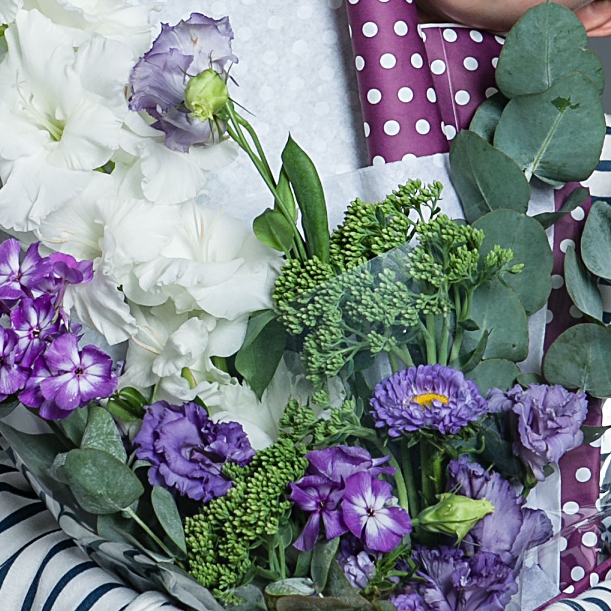Подобрать элегантный букет на 1 сентября – непростая задача. Я предлагаю соединить роскошный белый гладиолус с игривыми астрами, флоксами, седумом и эустомой в сине-фиолетовых оттенках. Композиция напоминает цветущий летний луг, яркий и ароматный. Завершает ее милая упаковка в горошек. Если вам понравилось сочетание цветов на фото, оформите заказ на нашем сайте!