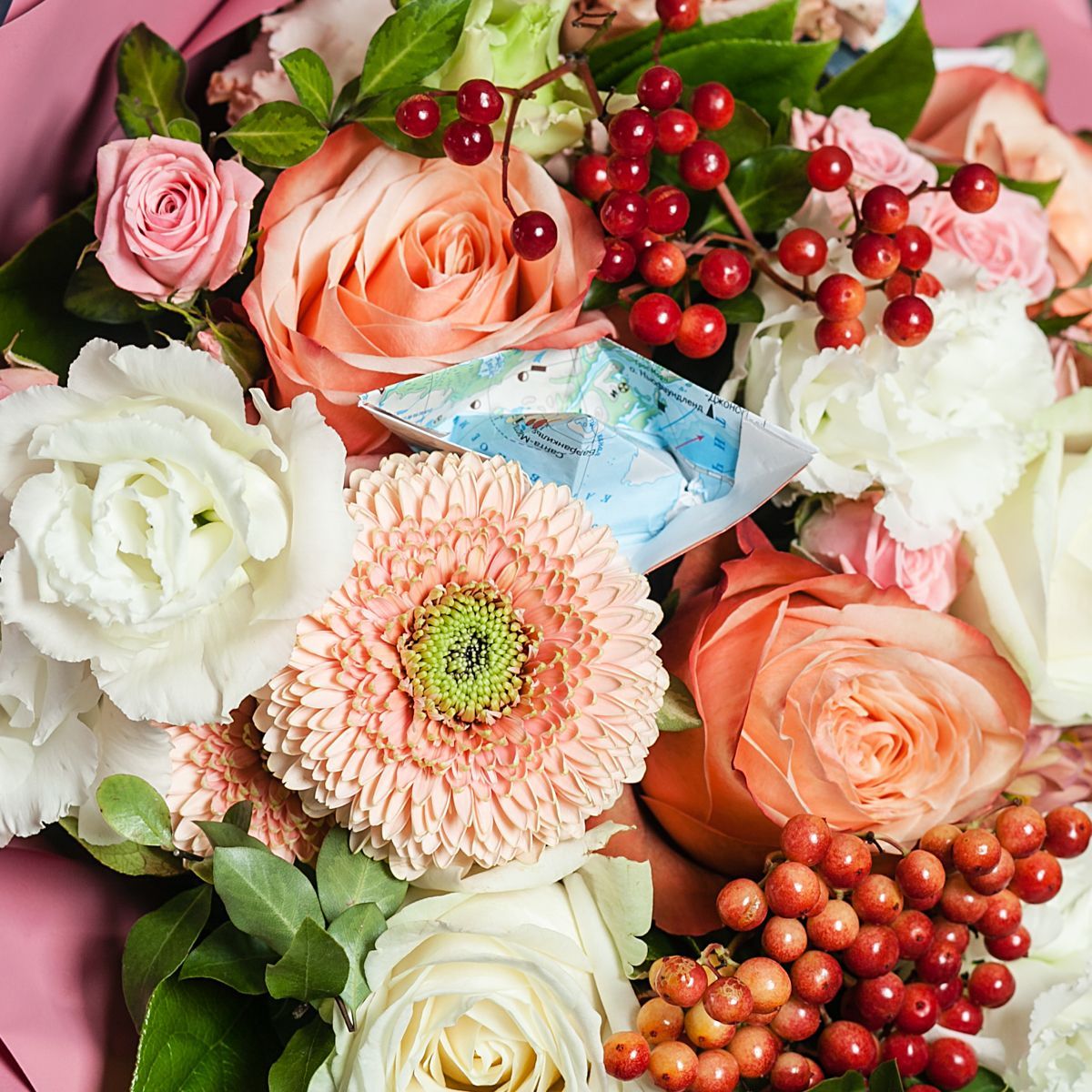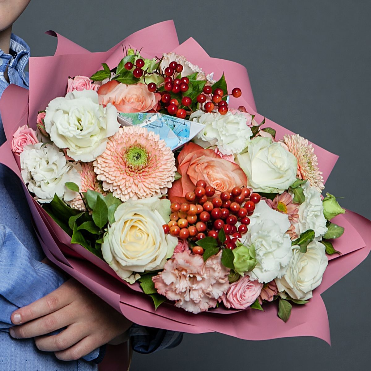 Нежные букеты выглядят уместно на любом празднике. 1 сентября — не исключение, особенно если вы хотите подарить цветы молодому учителю. Композиция из милых минигербер и кустовых роз с пышными бутонами эустомы и российской розы — беспроигрышный вариант. Пудровые и бежевые оттенки соцветий гармонично дополняет розовая упаковка, а нотку свежести привносят веточки вибурнума. Размер вы можете выбрать перед заказом, предварительно посмотрев фото на нашем сайте.