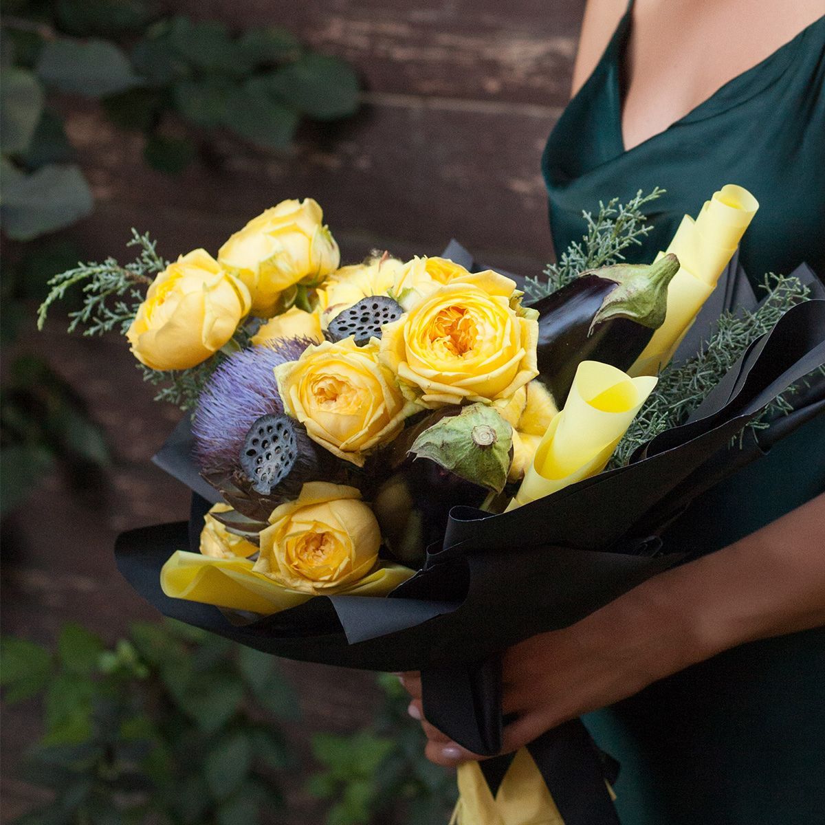 Стильный, сочный, оригинальный и эффектный букет, которым несомненно удастся удивить любого получателя. Это отличный вариант для тех, кто предпочитает небанальные флористические решения и свежие цветочные идеи. Работа станет достойным украшением интерьера и позволит продемонстрировать тонкое чувство вкуса дарящего. Оформление букета выполнено в темной цветовой гамме, на фоне которой сам букет выглядит особенно колоритно, свежо и изящно. Достойная альтернатива классическим цветочным композициям, эффектная и запоминающаяся.