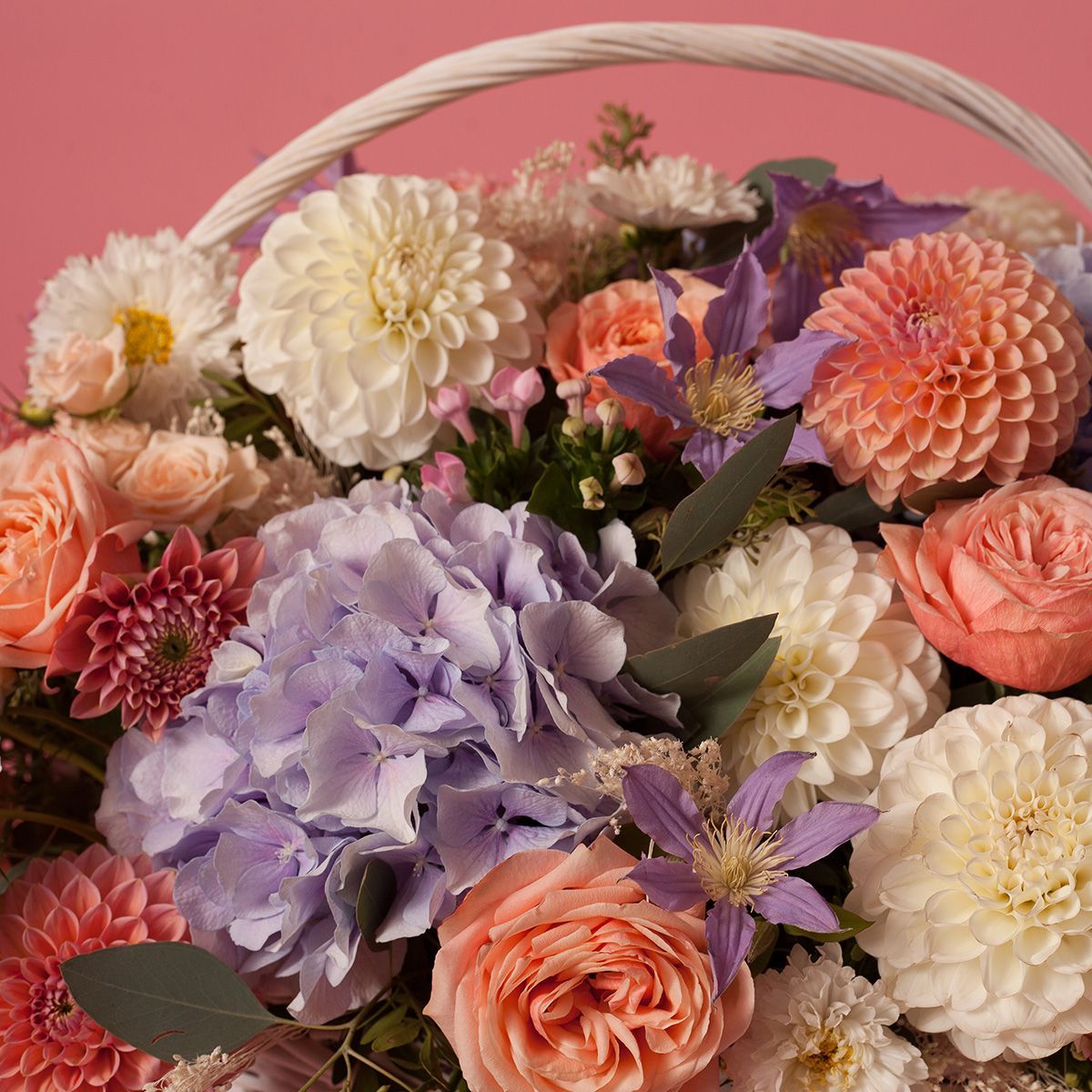 Букет в упаковке в виде корзины в свежих оттенках — хороший подарок для женщин на любой праздник. Красивая композиция из кустовых роз и цветков сорта Эквадор, георгин с гвоздиками, гортензий, клематисов с фисташкой и эвкалиптом подойдет для осени. Поздравление из осенних цветов в огромном количестве на фото и в жизни выглядит невесомым, будто на это событие вы купили облако розово-сиреневого цвета. Осенний букет по доступной цене напомнит о весенних днях и окунет в беззаботное время. Собрать цветы в любом размере из каталога интернет-магазина можно с доставкой заказа, чтобы поздравить в срок.