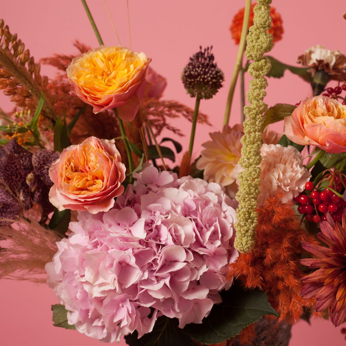 Красивая, нежная и элегантная композиция, выполненная в приятной приглушенной осенней цветовой гамме с нежно-розовым акцентов в виде пышного соцветия гортензии. Букет выделяется благодаря оригинальной форме и эффектному выбору цветов. Гармонично и интересно в единой композиции выглядят роскошные крупные голландские розы, эффектная орхидея, пышная кортадерия, статный аллиум и целозия, нарядные георгины, амарант и бруния. Достойный выбор, подкупающий креативным дизайном и благородной до последнего штриха, элегантной цветовой гаммой.