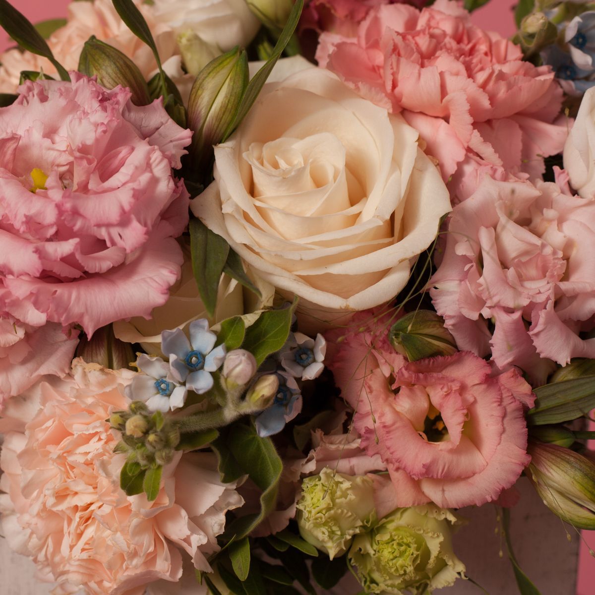 Букеты в розовых и пудровых оттенках ассоциируются с чистотой и нежностью, поэтому их часто дарят девушкам и используют для невест. Подарите его без повода холодной и дождливой осенью, чтобы напомнить любимой о солнечных весенних днях. Пушистые гвоздики, альстромерии и эустомы создают настоящее цветочное облако, в центре которого расположилась кремовая роза из Эквадора. Нежно-голубые мелкие цветы оксипеталума и веточка паникума добавляют изящества композиции и делают ее еще более воздушной. Вы можете получить заказ в размере, который представлен на фото, или выбрать другой. Для этого оформите заявку на сайте.