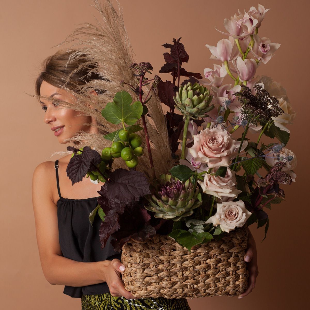 Изящная композиция, выполненная в благородных оттенках пыльной розы с акцентами насыщенного винного бургунда. Работа подкупает оригинальностью дизайна и актуальной цветовой гаммой. В ее основе роскошные голландские розы с крупными бутонами, потрясающие соцветия орхидеи, стильные пионы, экзотический артишок. В качестве эффектного декора гармонично и элегантно выглядит пышная кортадерия, пикантность работе придает эрингиум и физокарпус. Великолепный выбор для тех, кто предпочитает оригинальные букеты в современном стиле.