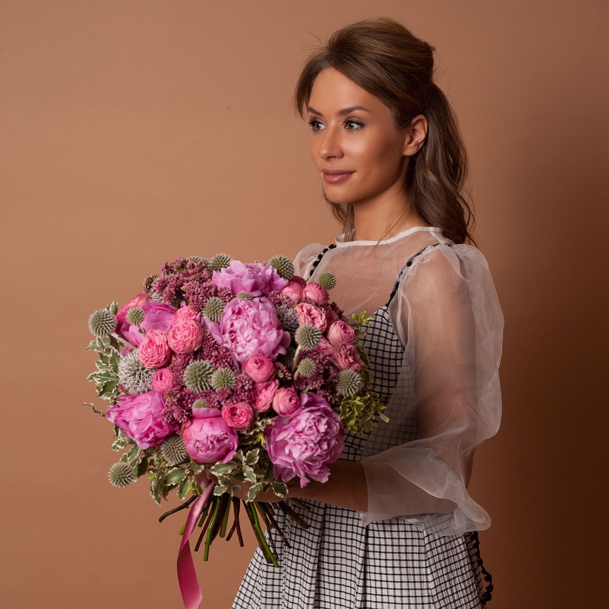 Оригинальный, стильный и изящный букет, представленный в актуальной, сочной сиренево-розовой цветовой гамме. В основе работы пышные пионы, миниатюрные аккуратные соцветия кустовой розы, которые гармонично дополнены экзотическими седумом, питтоспорумом, эхинопсом. Букет выполнен в практичном среднем размере. За счет оригинальности состава растений и плотного цветочного купола, он имеет презентабельный внешний вид и станет достойным украшением любого торжества, мероприятия, события. Отличный выбор для тех, кто ищет нестандартные цветочные решения и креативные дизайны во флористике.