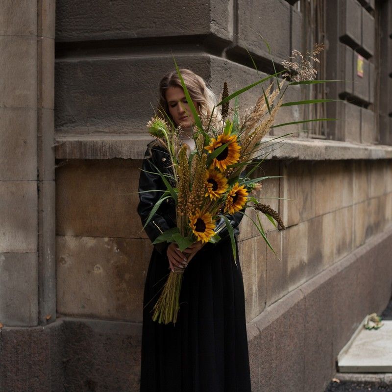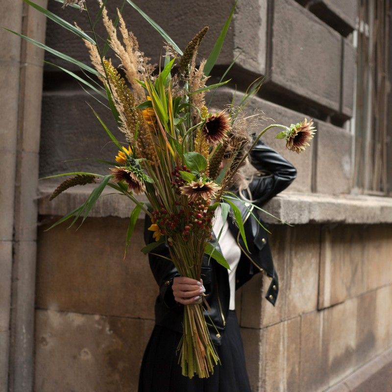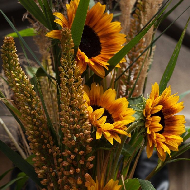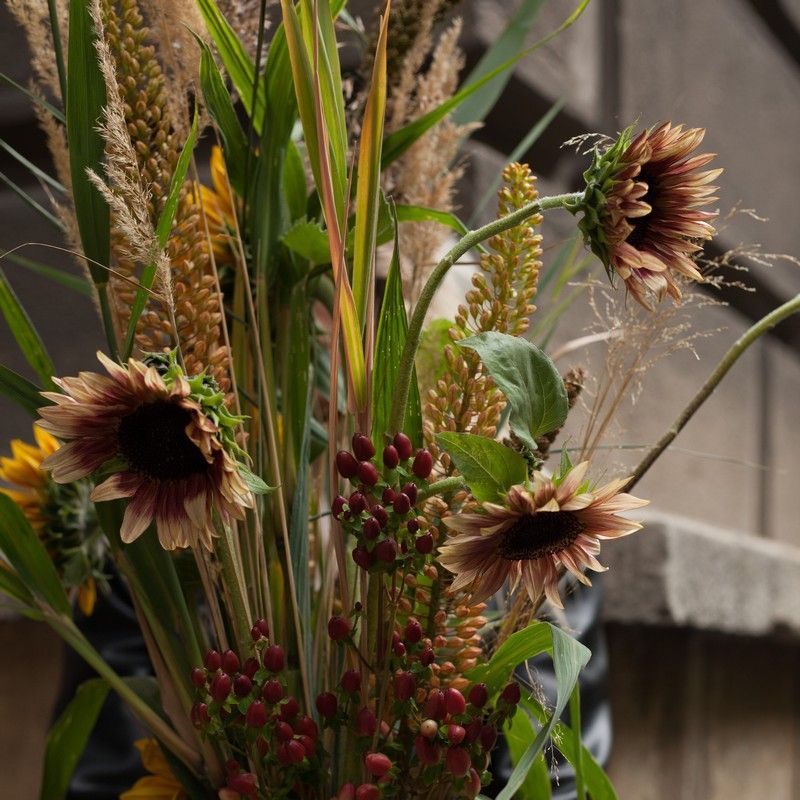 Букет из подсолнухов, сетарии и гиперикума №1211 среднего размера