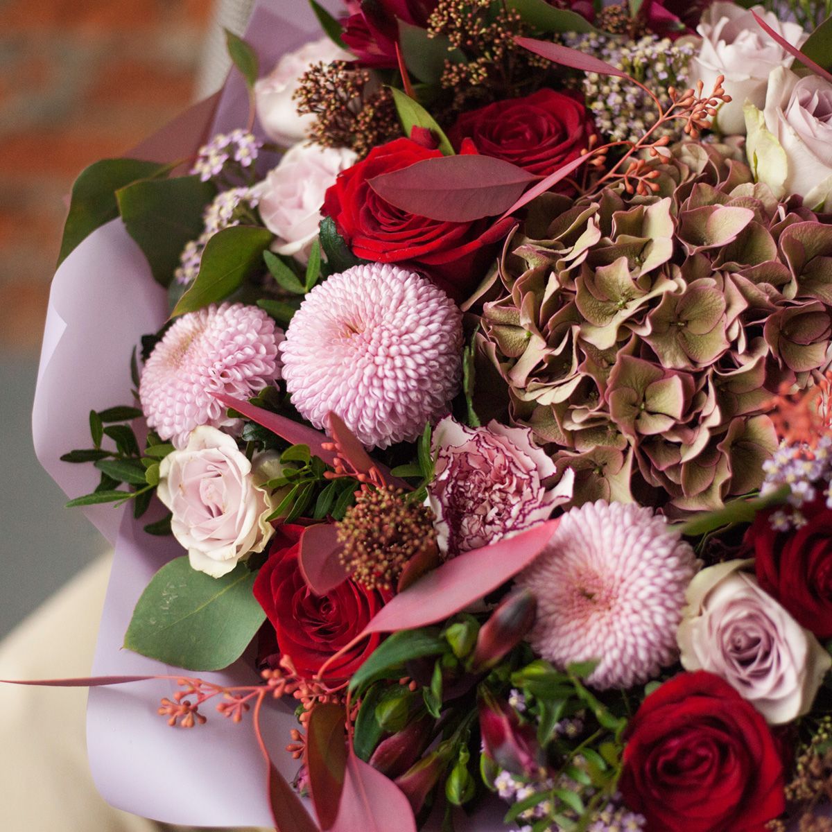 День матери — осенний праздник, на который будет уместно подарить букет в глубоких и насыщенных оттенках этой поры. Композиция соединила алый и розовый, коричневый и зеленый, бежевый и оранжевый — яркая картина привлечет внимание каждой мамы. Сочетание привычных цветов: гортензии, хризантем, роз сортов Россия и Голландия, гвоздик, альстромерий и ахиллей создало незабываемый и необычный цветочный ансамбль. Завершает его матовая пудово-розовая упаковка, оттеняющая сочные краски бутонов. При покупке мы дарим открытку, на которой можно написать пожелания получателю. Размер подбирается перед заказом, предварительно можно посмотреть фото на нашем сайте.