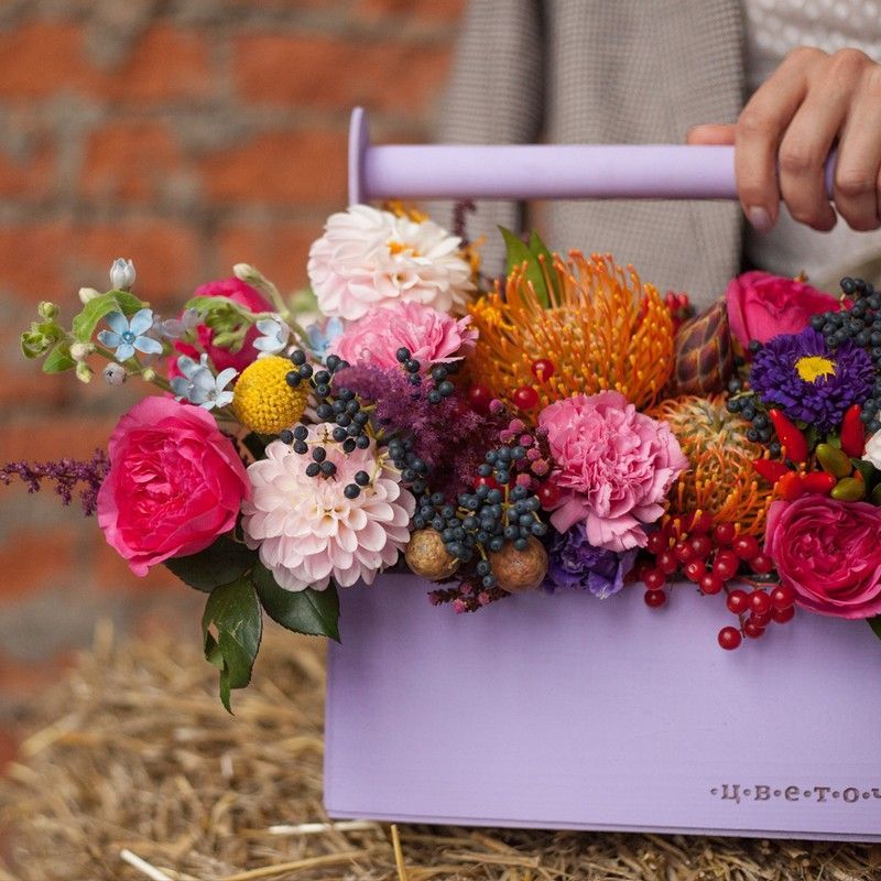 Летние краски — то, чего не хватает пасмурными осенними днями. День матери может стать отличным поводом, чтобы подарить маме частицу солнечного тепла в виде цветов в деревянном кашпо. Экзотические соцветия нутана и краспедии гармонируют с насыщенными бутонами садовой розы, гвоздик, целозий, астр, георгин и астильб, особую атмосферу вокруг которых создают мелкие цветки оксипеталума и вероники. В качестве дополнения композиции выбраны зелень вибурнума, ягоды шиповника и перец. Розовый, красный, желтый, фиолетовый — кажется, будто все оттенки собраны в небольшой упаковке в виде коробки. Размер можно подобрать при покупке. Оформляйте заказ на сайте заранее, чтобы получить букет к празднику.