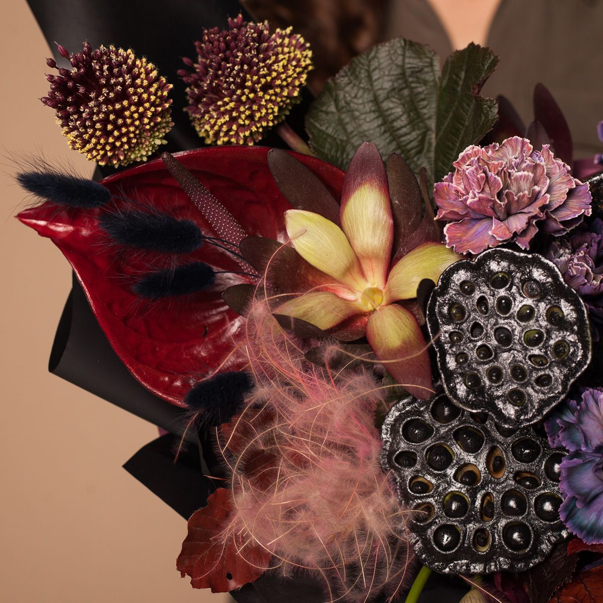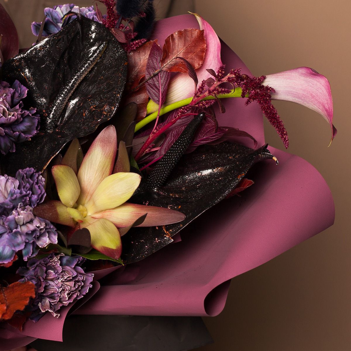 Потрясающе стильный, колоритный и эффектный букет, который однозначно будет выделяться на фоне всех других цветочных композиций. Работа выполнена в актуальной, солидной винной цветовой гамме с акцентами сиреневого тона разной степени интенсивности. Оригинальное цветовое решение великолепно дополнено оформлением в технике монохром. В работе использованы великолепные плоды лотоса, гвоздика, амарант, аллиум, эффектный антуриум насыщенного оттенка, нежные каллы, экзотический леукадендрон и лагурус. Отличное решение для тех, кто предпочитает креативные, небанальные букеты.