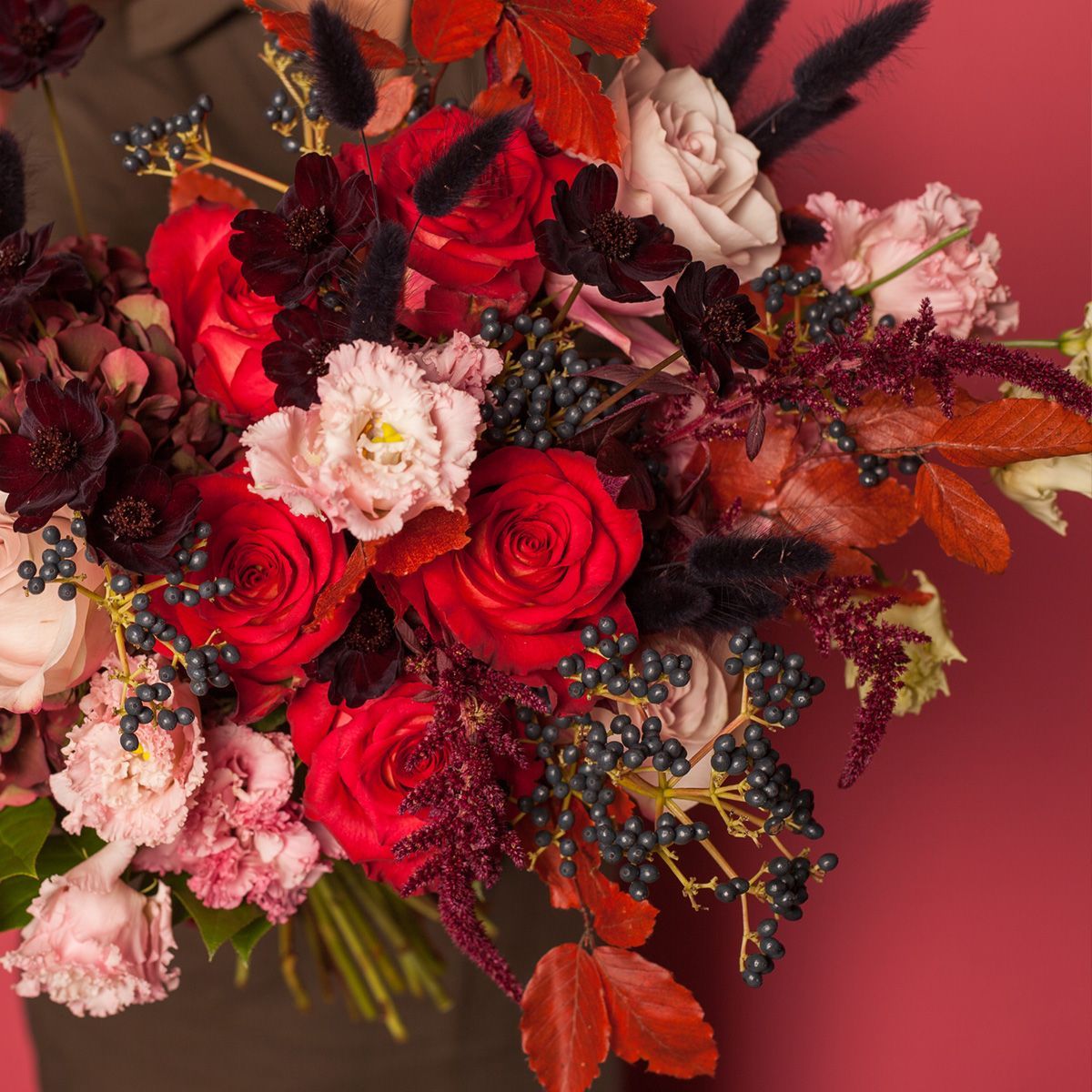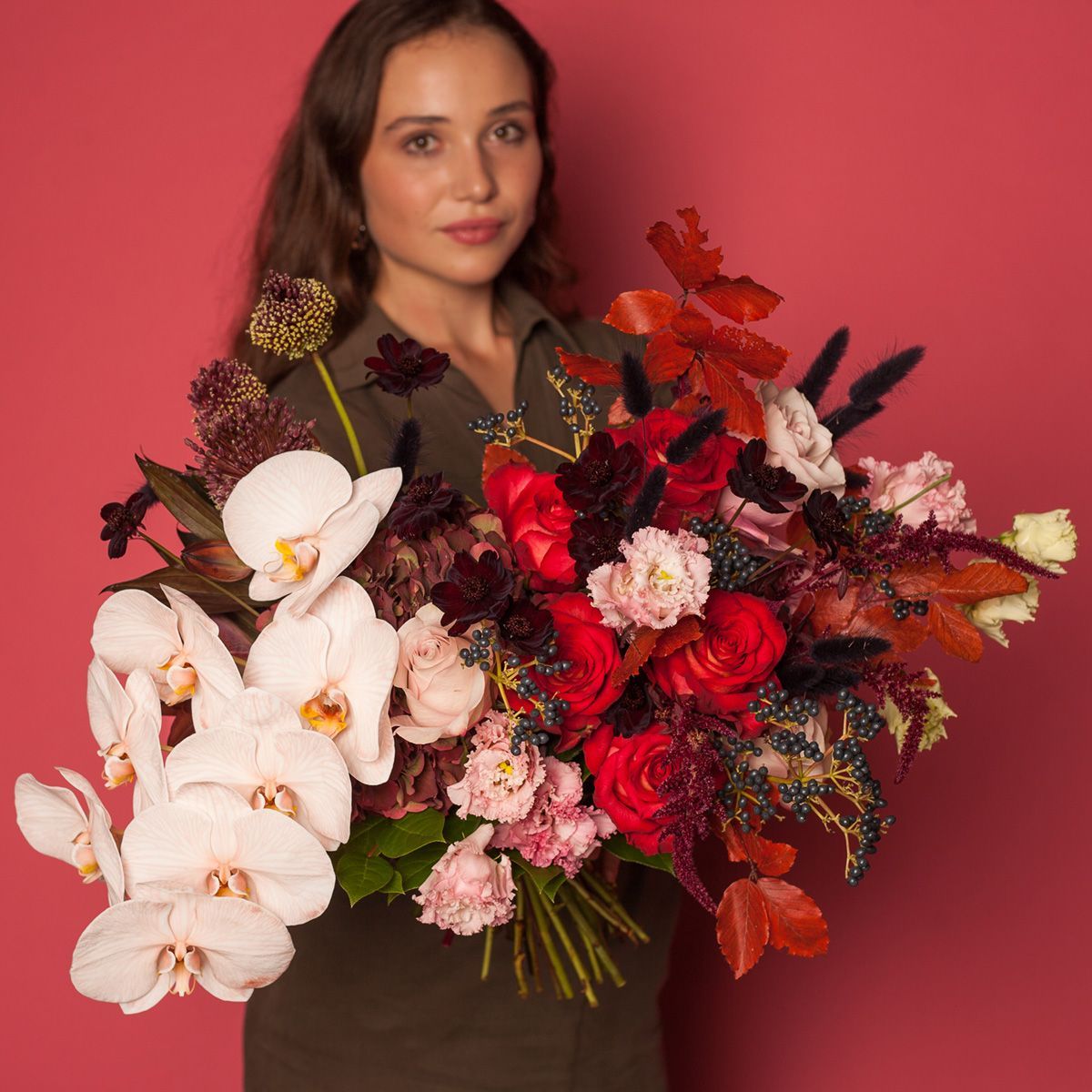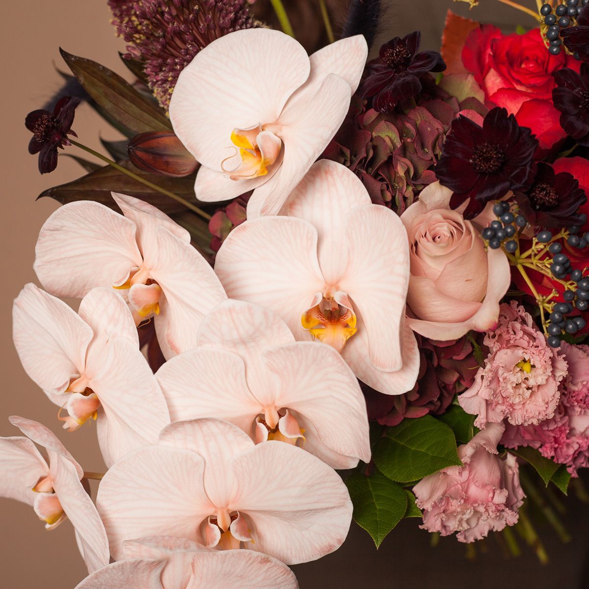 Потрясающий букет для самых торжественных случаев, важных мероприятий и памятных событий. Главный акцент в работе – потрясающие крупные орхидеи, которые благодаря контрастной цветовой гамме на фоне винных роз выглядят особенно привлекательно, свежо и эффектно. Работа выполнена в большом размере, в ней гармонично сочетаются в единую концепцию гортензия, изящные лилии, экзотический вибурнум, аллиум, амарант, розы и орхидеи. Великолепный вариант для тех кто ценит небанальные флористические решения и свежие идеи из мира флористики.