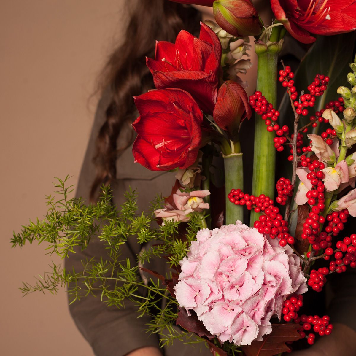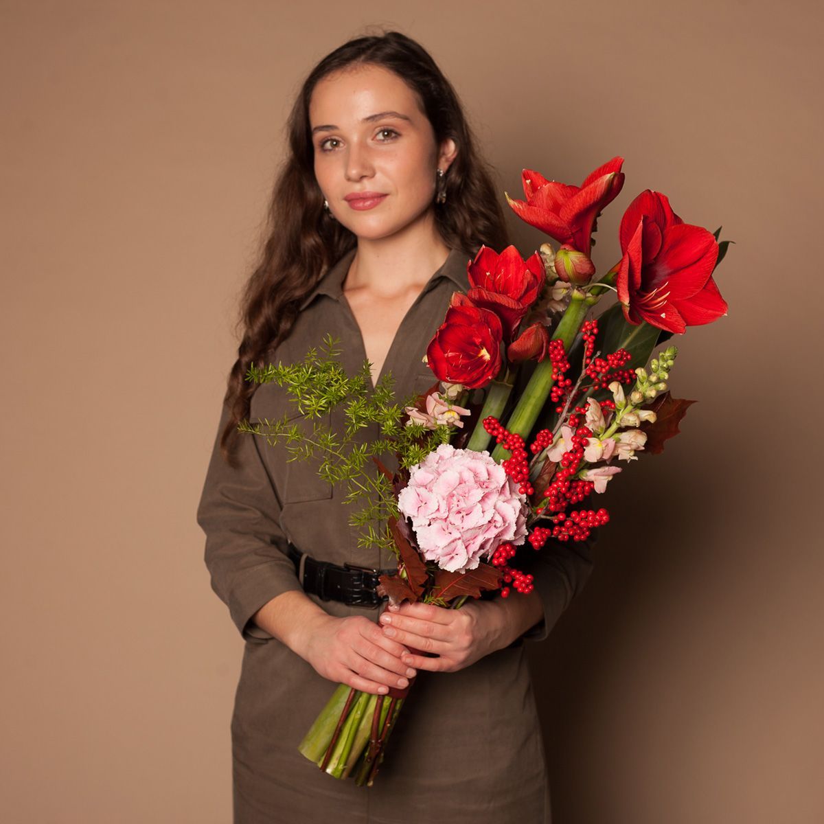 Стильный, элегантный, презентабельный букет, призванный удивлять и восхищать. Это отличный вариант для тех, кто предпочитает небанальные цветочные композиции. Работа мгновенно приковывает внимание благодаря сочному огненно-красному оттенку. В основе букета – роскошные амариллисы, которые по тону идеально сочетаются с илексом, так похожим на гроздья рябины. Контрастным акцентом выступает нежно-розовая гортензия. Чтобы она гармонично смотрелась в композиции, использован антирринум аналогичного оттенка. В качестве декоративного оформления выбраны сочные листья дуба, резной аспарагус.