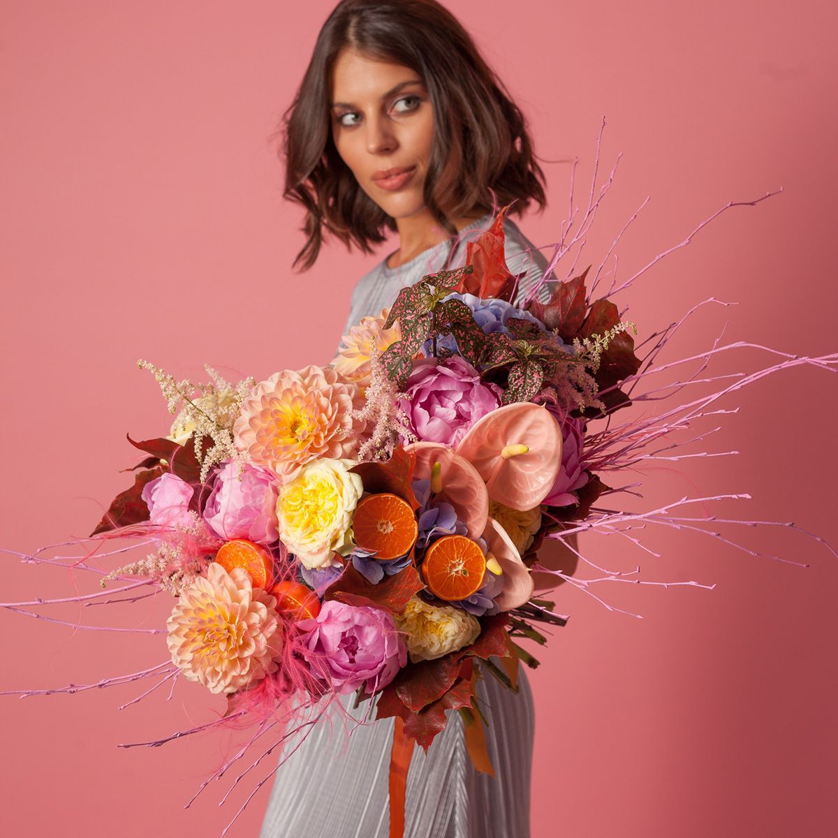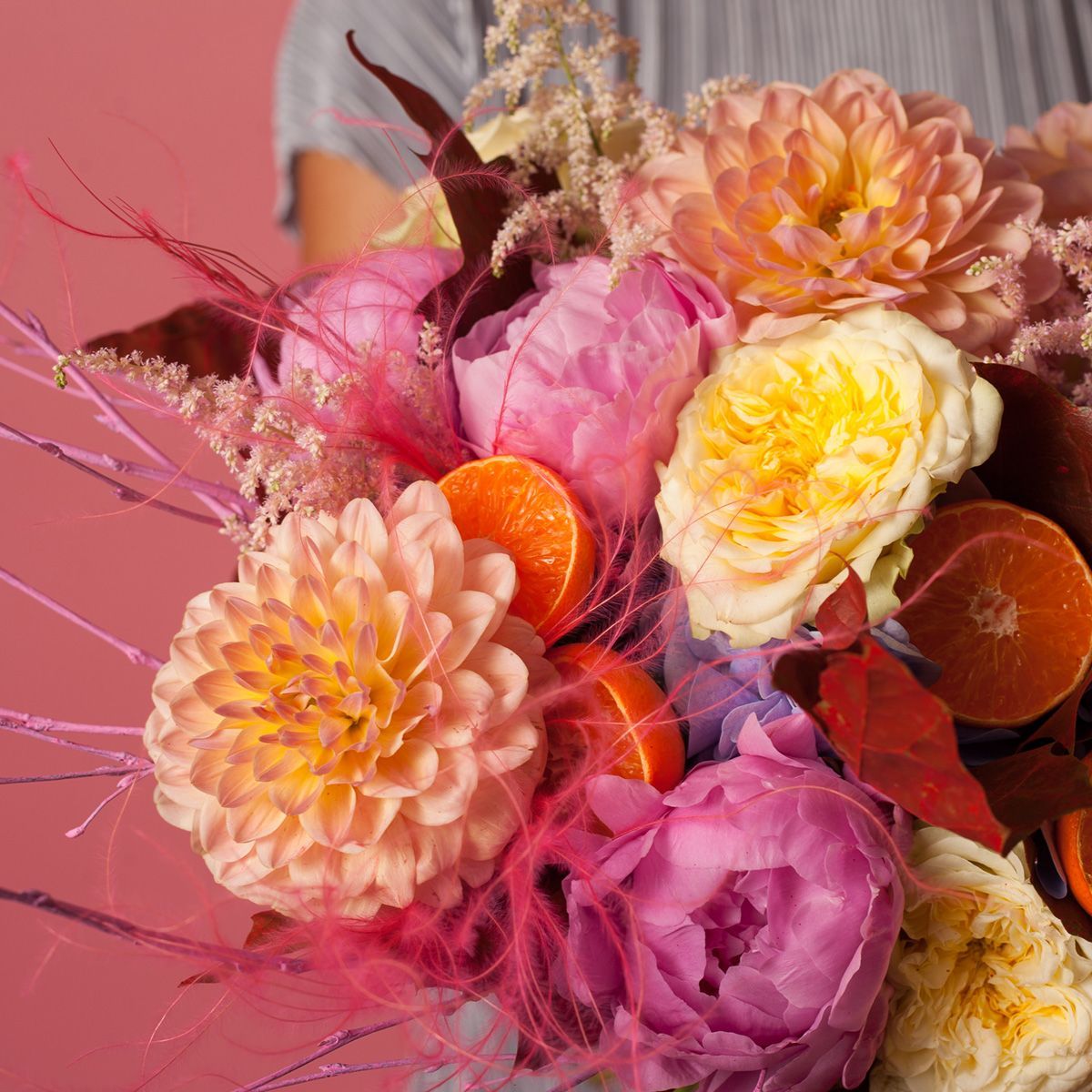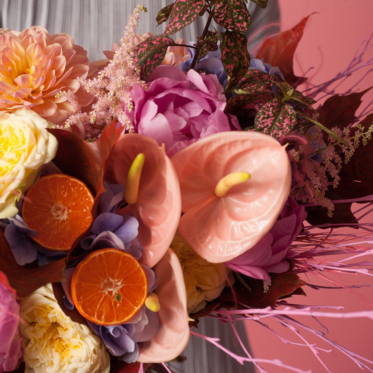 Яркая, креативная по дизайну и форме и роскошная по стилю композиция, способная произвести должное впечатление на любого получателя. Работа привлекает внимание насыщенной, сочной цветовой гаммой. В качестве колоритного акцента в ней использованы ароматные апельсины, потрясающий цвет которых задает тон всему букету. В основе композиции пышные георгины, элегантные пионы, изящные антуриумы в нежно-розовом оттенке. Дополнительный объем букету придают ветки березы, листья дуба, популярная во флористике стифа. Отличный вариант небанального букета, которым можно порадовать и удивить.