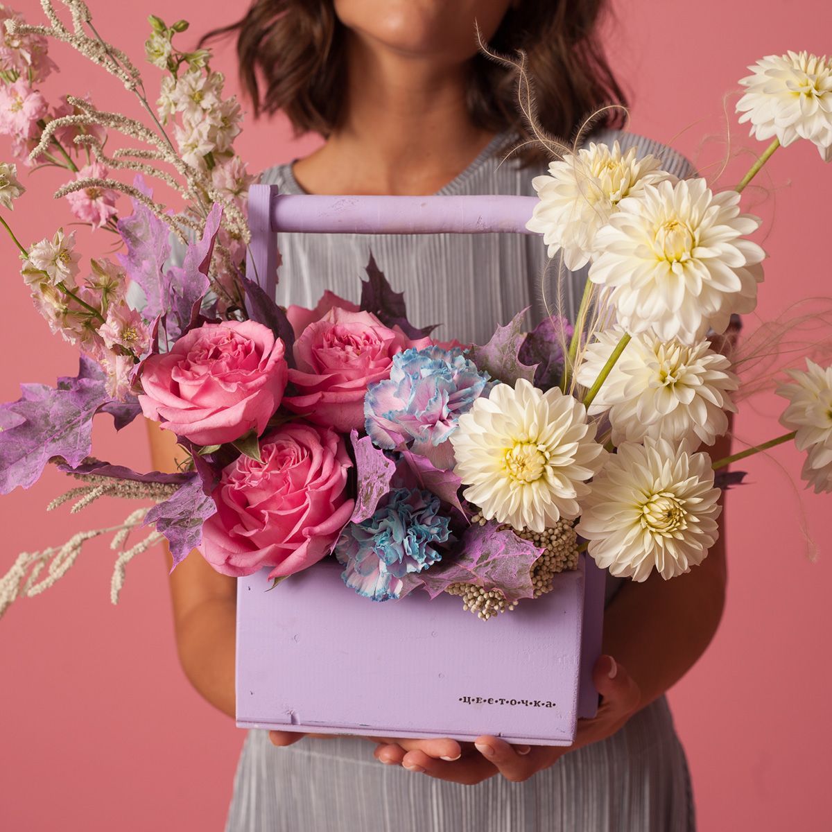 Элегантная и стильная композиция, выполненная в нежной цветовой гамме. В основе работы – эффектные георгины, экзотический дельфиниум, гвоздики оригинального оттенка. Работа привлекает внимание гармоничным сочетанием цветов, их лаконичной подачей, благодаря чему все композиция выглядит аккуратно, изящно и нарядно. Букет представлен в маленьком размере. Оформлен в виде флористического бокса с ручкой (самый удобный формат для транспортировки и расположения в интерьере). Отличный выбор для приятного знака внимания, комплимента или подарка по любому поводу.