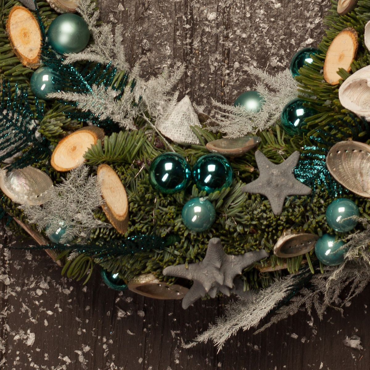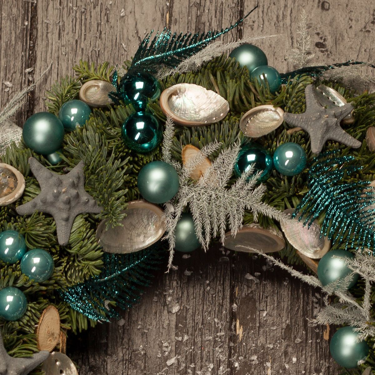 Классический новогодний венок с шишками давно можно встретить в праздничном интерьере современных квартир. Мы решили поэкспериментировать и добавить в композицию украшения не только в виде новогодних изделий, но и ракушек с морскими звездами. За основу зеленого букета взяты еловые ветки нобилиса и аспарагуса плюмозуса, оттенок которых гармонично выделяет елочные украшения, — такой подарок на Новый год и Рождество создаст атмосферу волшебства в каждом доме в зимние дни. Если вы хотите купить новогодний декор, то оформляйте заказ на сайте.