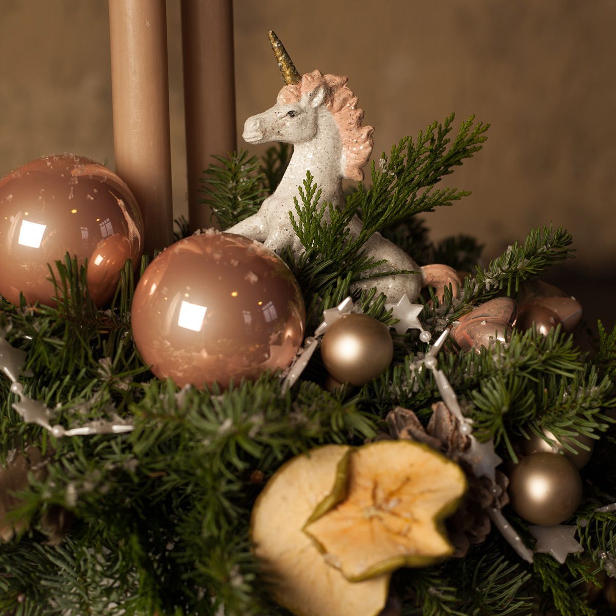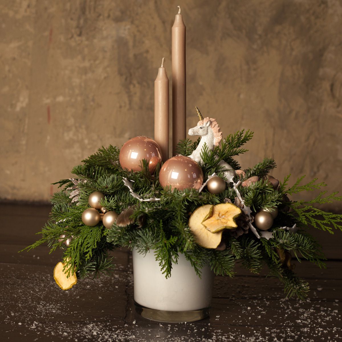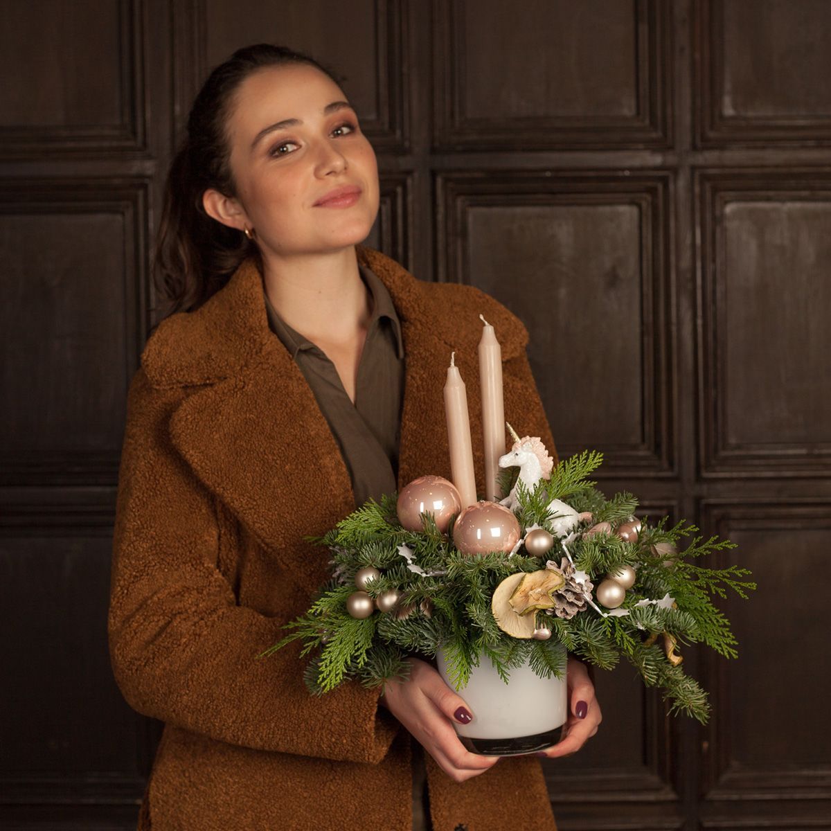 Нобилис — стойкое растение, поэтому новогодняя композиция из него будет долго стоять, дополняя интерьер дома. Новогодние изделия в виде шаров шишек, свечей и единорога в спокойных оттенках придают подарку дополнительное очарование. Поздравить композицией с Новым годом можно коллег и родственников — свежий хвойный аромат наполнит квартиру волшебной атмосферой и радостным предвкушением праздника. В интернет-магазине можно купить поздравления с открыткой и оформить доставку к событию: размеры сборок, фото и цены доступных к заказу смотрите в каталоге.
