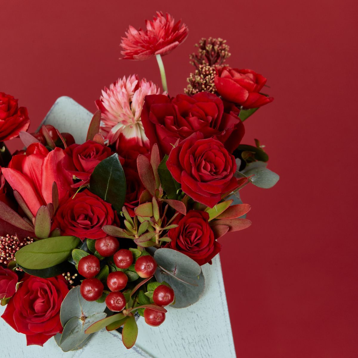 Композиции красного оттенка – это букеты, которые выражают любовь и страсть и никогда не остаются незамеченными. Ими можно поздравить любимую женщину с днем рождения или купить сочетание без повода. Флористы собрали свежие ранункулюсы, кустовые розы и сорт Эквадор с тюльпанами и анемонами в деревянном кашпо, чтобы мужчина без слов сказал о важном и сделал поздравление запоминающимся. Упаковка в виде ящика маленького размера добавляет подарку утонченности. Оформить заказ цветов в любом количестве в интернет-магазине с доставкой можно, посмотрев фото, цену и получив открытку к празднику.