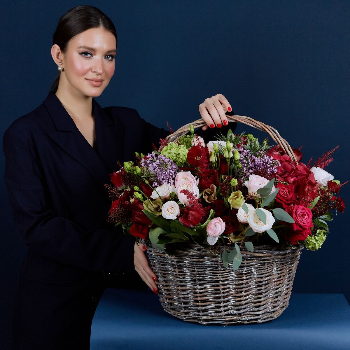 Эффектная корзина, мгновенно приковывающая к себе внимание. Оригинальная цветовая гамма работы делает каждый ее элемент самодостаточным и колоритным. В букете использованы три вида розы, ароматная сирень, тюльпаны, астильба, ранункулюс, вибурнум. Элегантность и аристократизм букету придает зелень эвкалипта благородного глубокого бирюзового оттенка. Работа выполнена в большом размере, идеально подойдет для самых торжественных случаев и достойно украсит собой любое мероприятие. Отличный выбор для стильного декора интерьера.