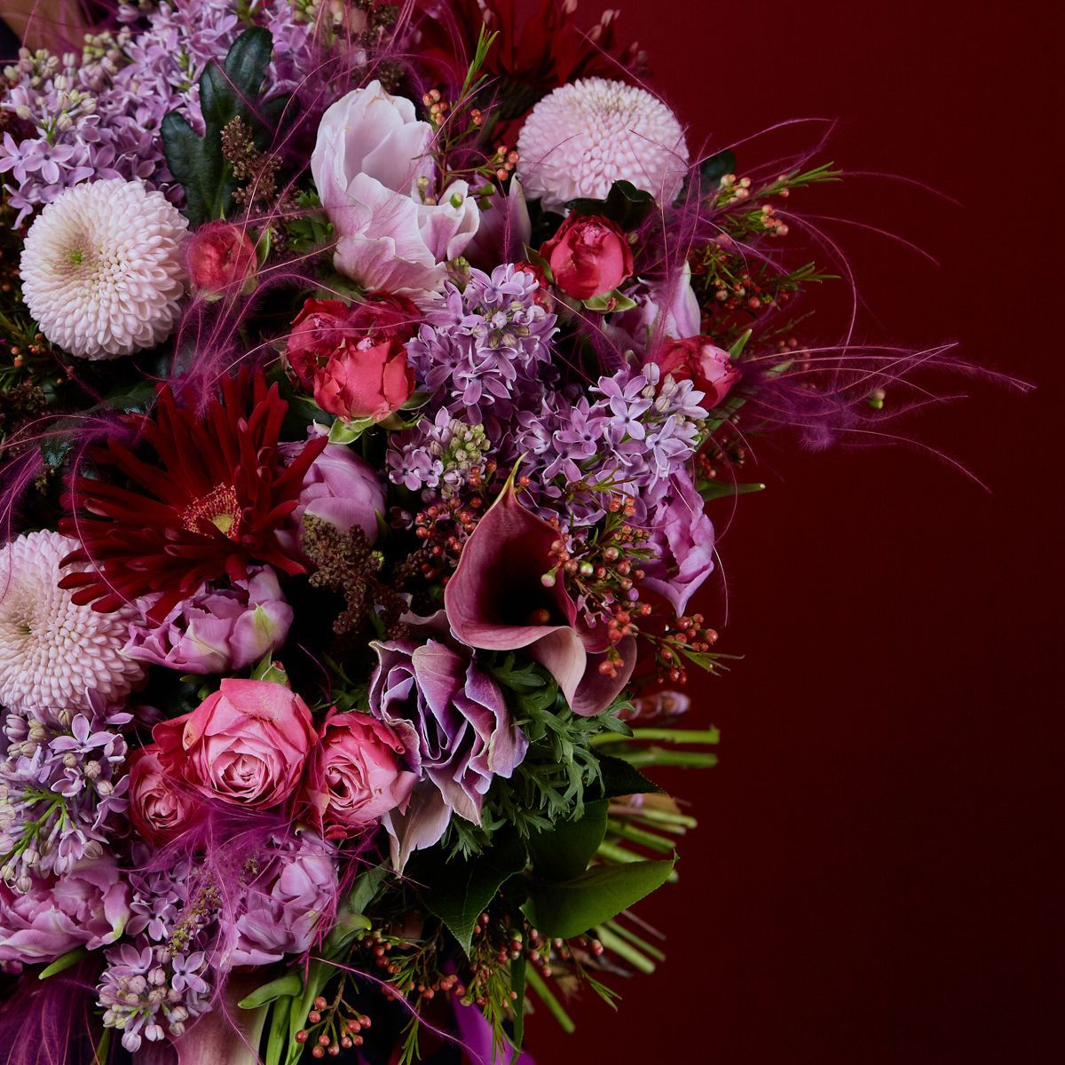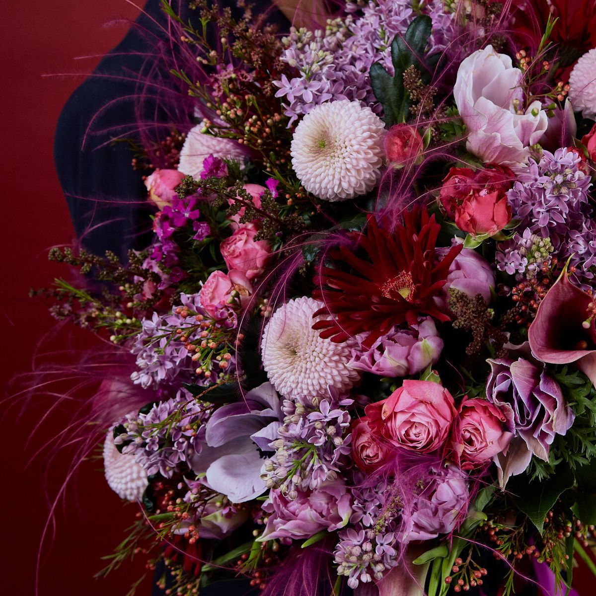 Не знаете, как поздравить любимую женщину в день рождения или другой праздник? Преподнесите поздравление в виде эффектного букета в сиренево- малиновых оттенках без упаковки. Флористы собрали свежие кустовые розы, тюльпаны, астильбы, анемоны и герберы, оттенив их бутонами хризантем, калл, гвоздик и сирени, чтобы мужчина произвел впечатление и выразил любовь. Композицию разбавили хамелациум, салал и стифы, а легкости добавила атласная лента. Заказ подарка с открыткой возможен в любом размере и количестве цветов. Купить его по любому поводу можно, посмотрев фото и цены в каталоге и оформив доставку.