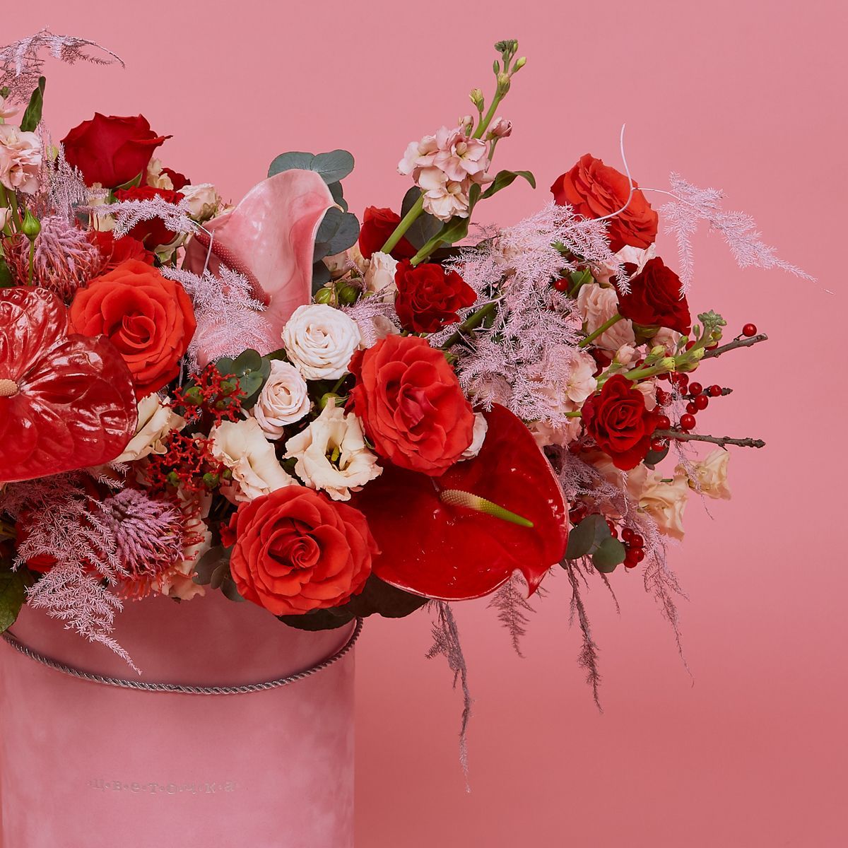 Огромный букет в шляпной коробке розового цвета на день рождения и День святого Валентина придется по душе мечтательным особам, которые любят нежные цветки. В упаковке свежего цветочного поздравления разместились красивые илексы и эустомы, российские, эквадорские и кустовые розы, а также нутаны с маттиолами. Приятный оттенок композиции добавляют и антуриумы, гвоздики, аспарагус с веточкой эвкалипта. При сборке к празднику мы положим открытку, благодаря которой вы сможете поздравить дорогого человека не только цветами, но и искренними словами. Купить подарок с доставкой к событию в нашем интернет-магазине просто: подберите количество бутонов и размер по фото в каталоге, и цена заказа появится в корзине.