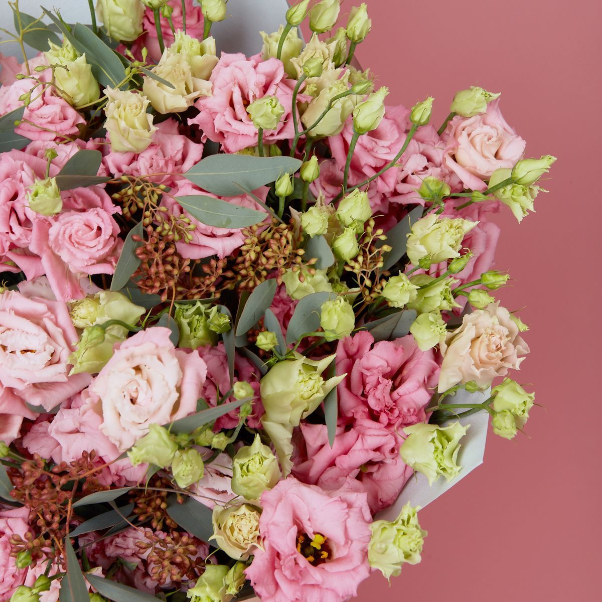Нужен нестандартный красивый букет на день рождения или другое важное событие? Берете эустомы нежно-розового и желтого цвета, разбавляете нежной зеленью эвкалипта — и получаете композицию, от которой веет летним садом и красочным лугом. Завершает образ упаковка из бумаги цвета эвкалипта, подвязанная лентой. Такое решение понравится каждой девушке и сделает поздравление запоминающимся.