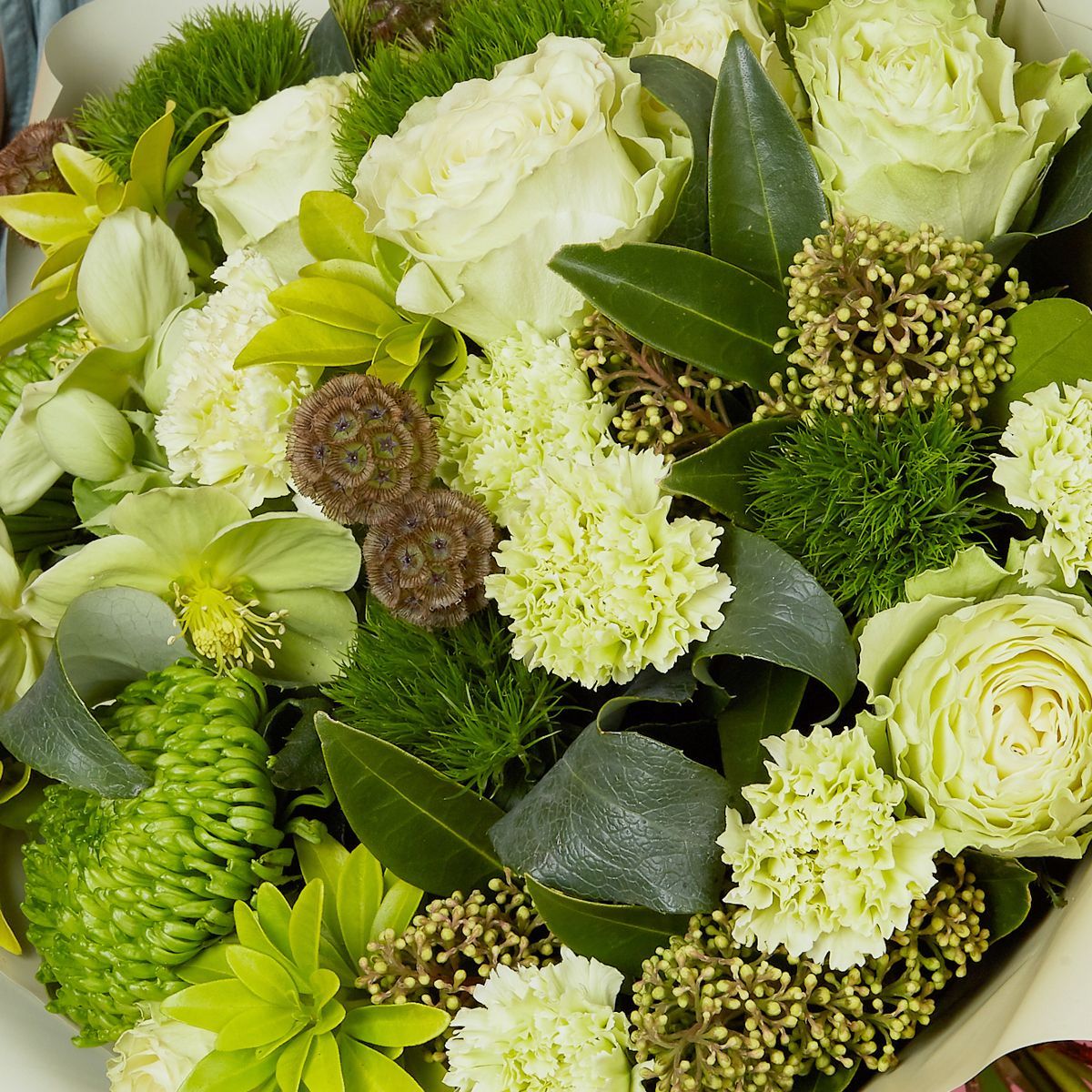 Свежим весенним букетом можно поздравить любимую как в морозный зимний день, так и солнечным летом. Желто-зеленые оттенки цветов в качестве дополнения к подарку на день рождения оценит любая женщина, ведь бутоны пышных роз сорта Эквадор, скабиоз, гвоздик, морозника с бруниями и хризантемами наполнят дом приятным ароматом. Сочной зелени в композицию добавили с помощью чойзии и скиммии. Матовая упаковка с лентой в тон – лаконичное обрамление цветочного поздравления, купить который можно во всех размерах. К каждому заказу на праздник предусмотрена открытка. Фото с ценами доступны в каталоге.