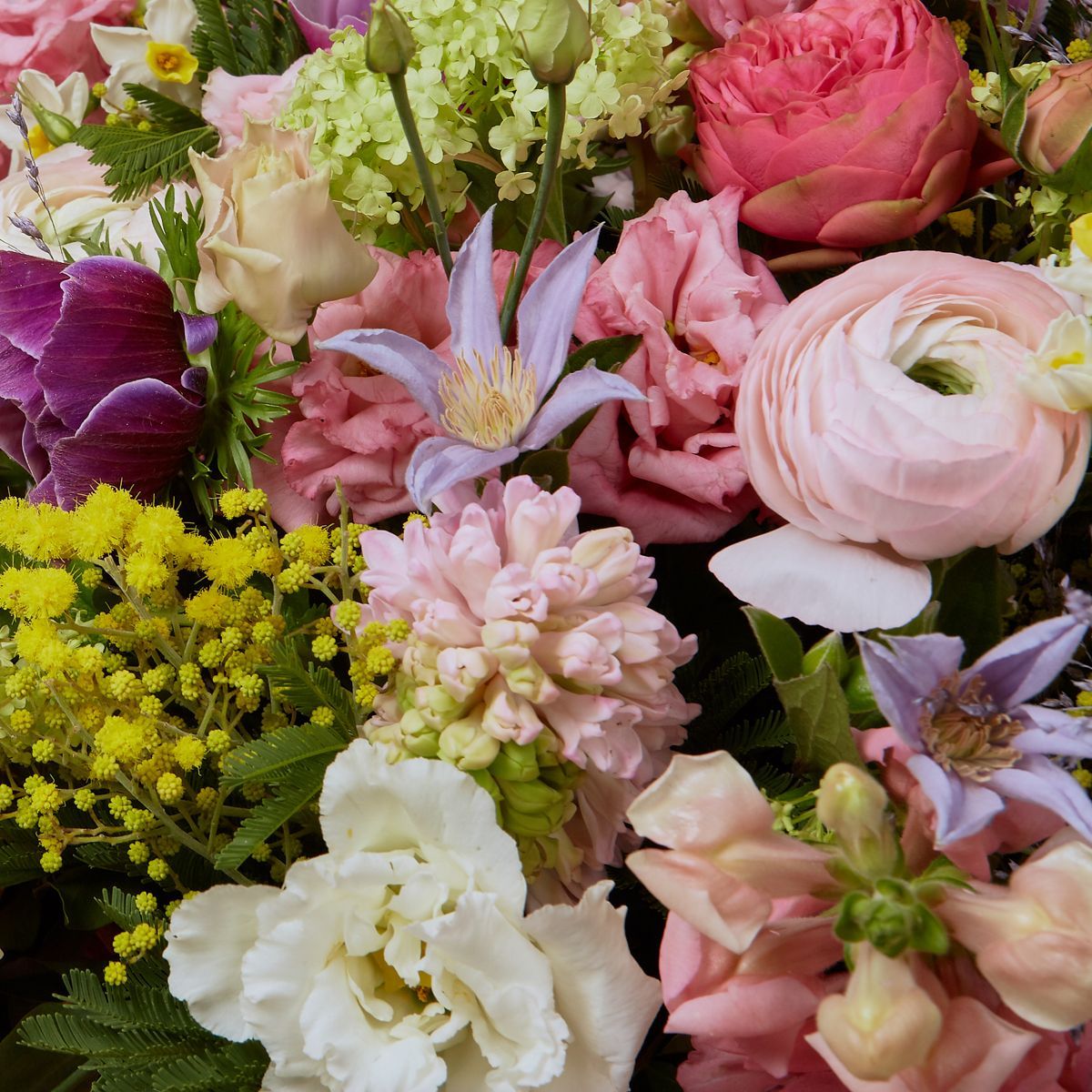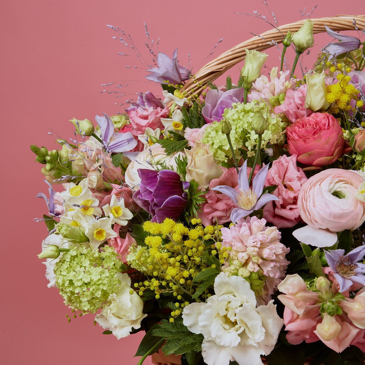 Цветы в большой корзине на День рождения или юбилей – классика среди подарков на любимый праздник. Шикарным букетом в размере XL можно поздравить юных романтичных особ, ведь цветочное поздравление включает нежные ранункулюсы, анемоны, гиацинты, клематисы и антирринумы. Сочные оттенки в композицию вносят бутоны эустомы, нарциссов и мимозы. Нотки зелени и свежести добавляют веточки сиергаса, вибурнума, салала и фисташки. Внутрь стильной плетеной упаковки мы положим открытку для ваших пожеланий. Чтобы купить сочетание, выбирайте заказ в каталоге, заранее посмотрев фото с ценами на сайте