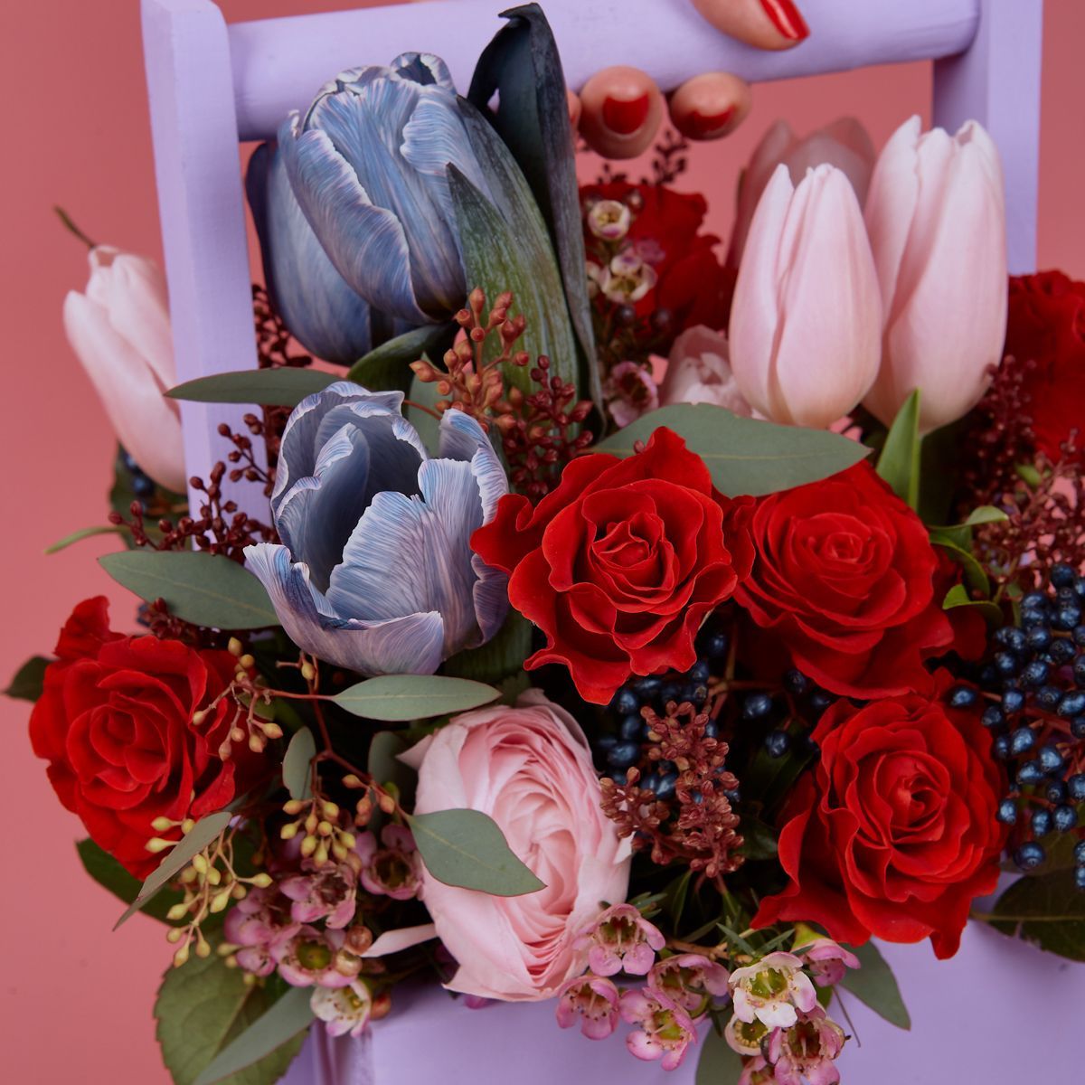 Какая девушка не хочет сделать в свой день рождения фото с шикарными цветами? Для этого подойдет композиция в деревянном ящике сиреневого оттенка с нежными тюльпанами, ранункулюсом, розами Россия, гвоздикой, веточкой хамелациума с зеленью скиммии и вибурнума. Весенний букет в оригинальной упаковке уместно подарить на праздник возлюбленной или подруге. Поздравление запомнится не только красотой, но и стойкостью бутонов. Внутри коробки в подарок к каждому заказу мы кладем открытку. Купить его можно в любом размере — в каталоге с ценами вы легко найдете тот, которым захотите поздравить любимую.
