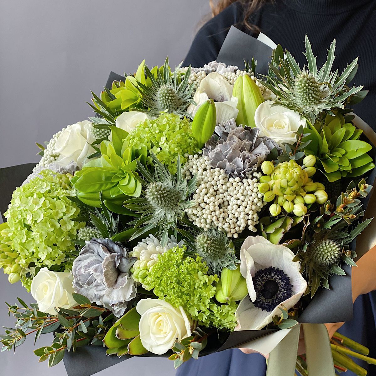 Дыхание весенней свежести в виде цветочной композиции приятно получить каждой женщине. Купить букет в бежево-зеленых оттенках можно на День рождения, юбилей и другой праздник, когда хочется подчеркнуть искренность чувств. Это возможно благодаря анемонам, розам Россия, орнитогалуму, ранункулюсу и гвоздикам. Их оттеняют бутоны эрингиума, гиацинта, лилии, веточек леукадендрона, вибурнума, шуазии и озотамнуса. Поздравление из цветов дополняет матовая упаковка с лентой. Размер и цена заказа указаны в каталоге с фото. К нему мы добавим открытку, чтобы вы могли эффектнее поздравить любимого человека.