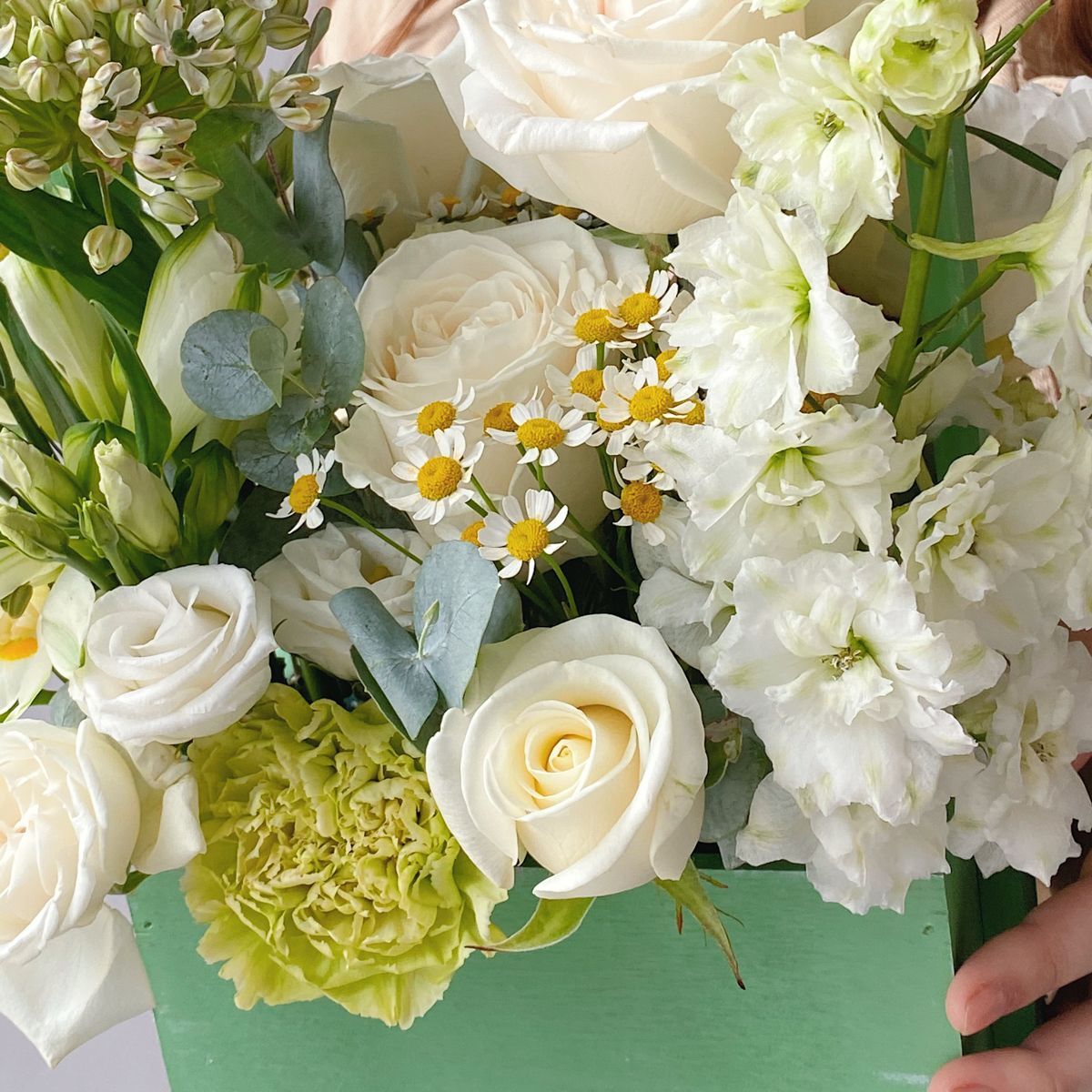 Наглядный пример того, как элегантно, стильно и интересно может выглядеть даже небольшая цветочная композиция. Работа выполнена в универсальной и торжественной белоснежной гамме с небольшими акцентами сочно-салатового тона. Гармонично в этом исполнении выглядит и основа букета – флористическое кашпо оттенка светлой бирюзы. В работе использованы эквадорская и российская розы, эустома, дельфиниум, пион, гвоздика, альстромерия, матрикария, аллиум. Беспроигрышный вариант небольшого букета, способный произвести впечатление и надолго остаться в памяти каждого получателя.