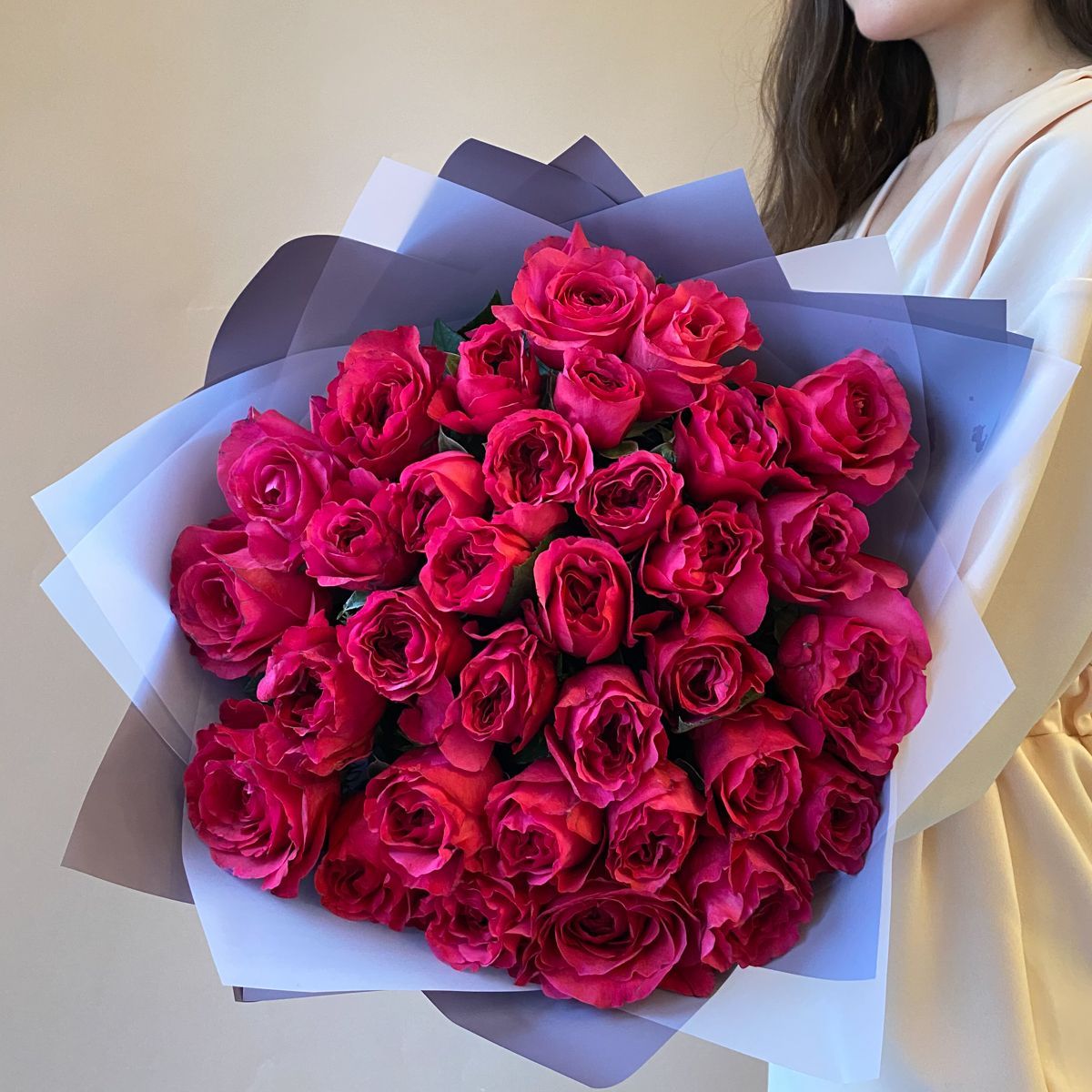 Яркий, сочный, презентабельный букет в благородном винном оттенке. В композиции используются крупные пионовидные садовые розы, бутоны которых формируют плотный цветочный купол. Работа мгновенно приковывает к себе внимание и производит приятное впечатление. Красивый, благородный оттенок бутонов роз и их натуральная эстетика делают этот букет максимально элегантным. Интересным, дизайнерским решением является выбор контрастных тонов для оформления (небесно-голубой, графит), на фоне которых цветы выглядят еще более колоритно и ярко.