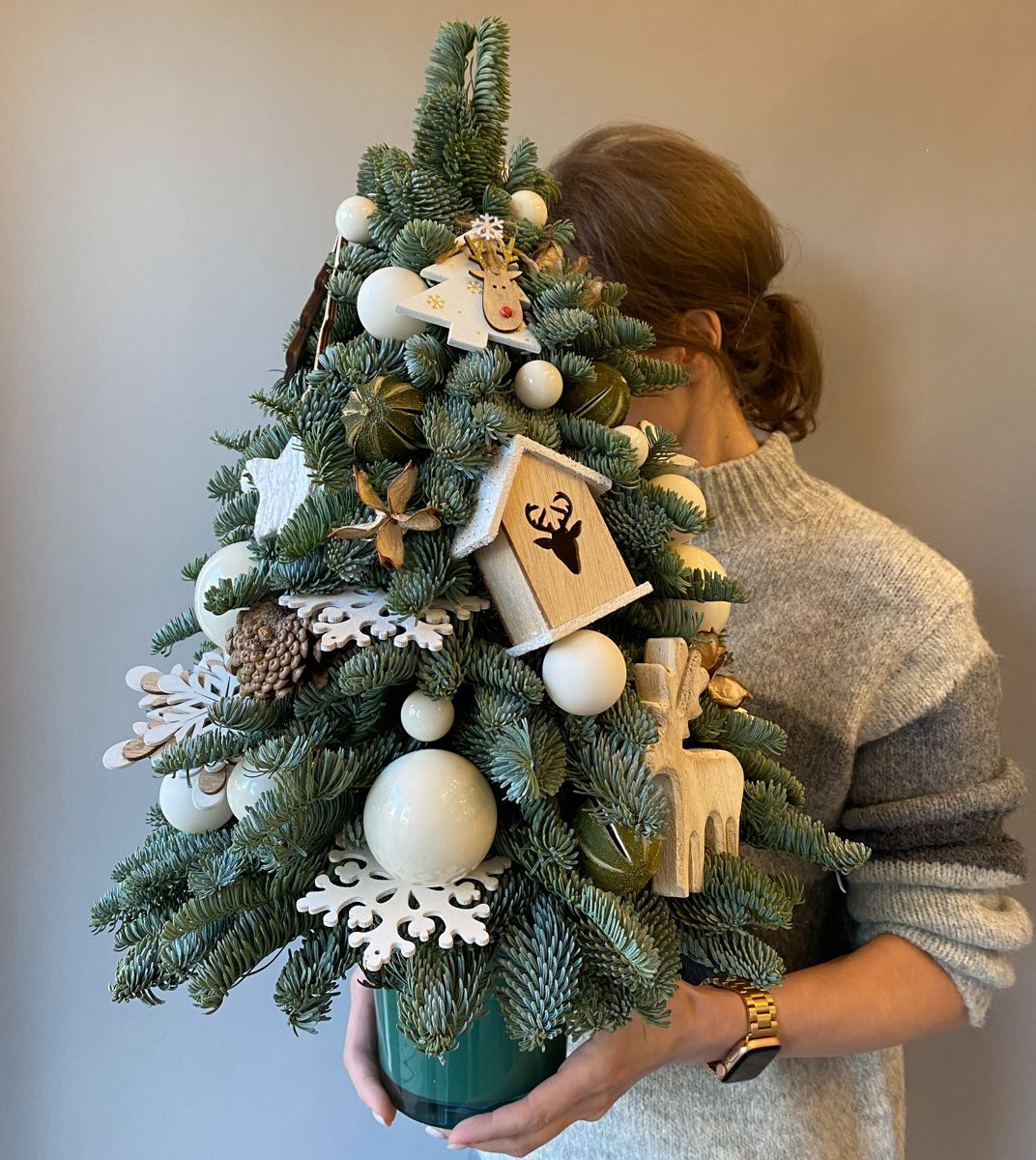 Елочка небольшого размера из нобилиса, украшенная новогодними игрушками светлых оттенков, — хорошая альтернатива крупным елям и оригинальный вариант, чтобы поздравить близких с Новым годом. Благодаря свежему хвойному аромату и универсальному дизайну новогодняя композиция подойдет для украшения домов, квартир и офисов к празднику. Купить поздравление можно в нашем интернет-магазине. В каталоге вы можете посмотреть фото до заказа и узнать цену подарка. При сборке мы добавим открытку. Оформить быструю доставку композиции можно к событию.